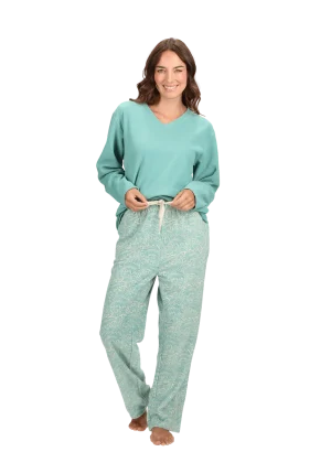 Pijama de dos piezas, su polera de polar con un elegante cuello en V y un pantalón estampado que incluye bolsillos y un amarre ajustable en la cintura para un calce personalizado y cómodo.