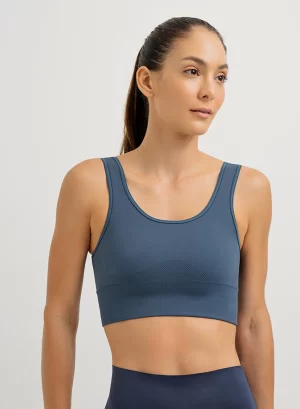 Top deportivo con soporte medio, sin copa. Silueta ajustada, cuello redondo y espalda tipo u, tiras anchas y base alta. Hecho en Colombia.