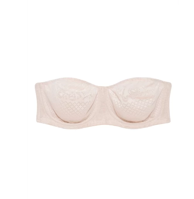 Brasier strapless que reduce el busto hasta una talla. Copas de encaje de cobertura total con forro de malla transparente para dar forma. Cuenta con bandas de silicona en el interior del brasier, en el borde inferior y superior de las copas, que ayuda a mantener el sujetador en su lugar. Con broches en la espalda. No incluye tirantes.
