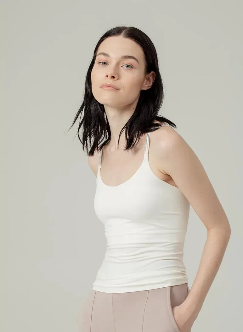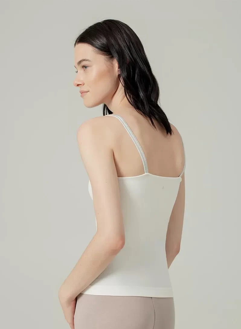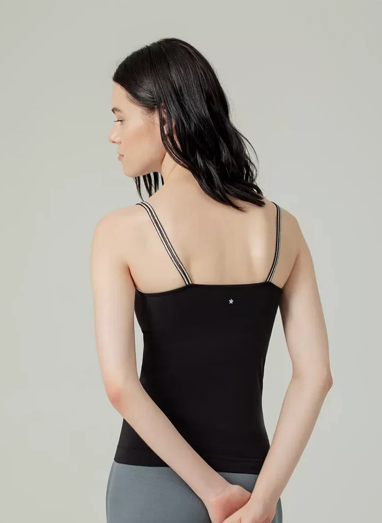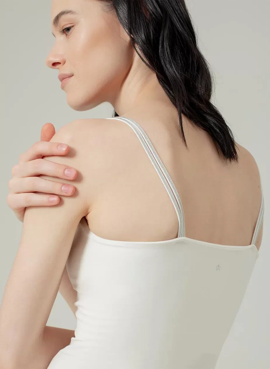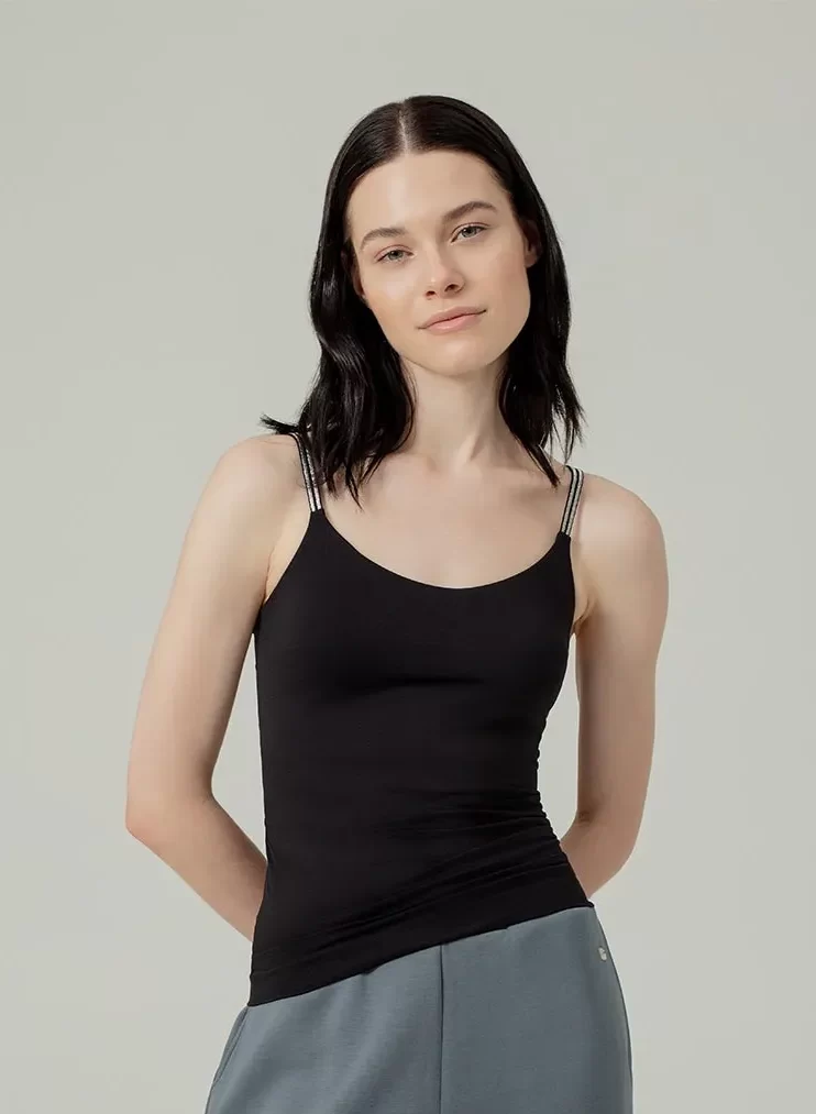 Camiseta Aoway de tiras en microfibra, ideal para uso exterior o interior. Tiene el escote redondo, con costura interna. Top interno de doble forro para menor transparencia y mayor soporte del busto. Tiras delgadas dobles con detalle de brillo delicado.