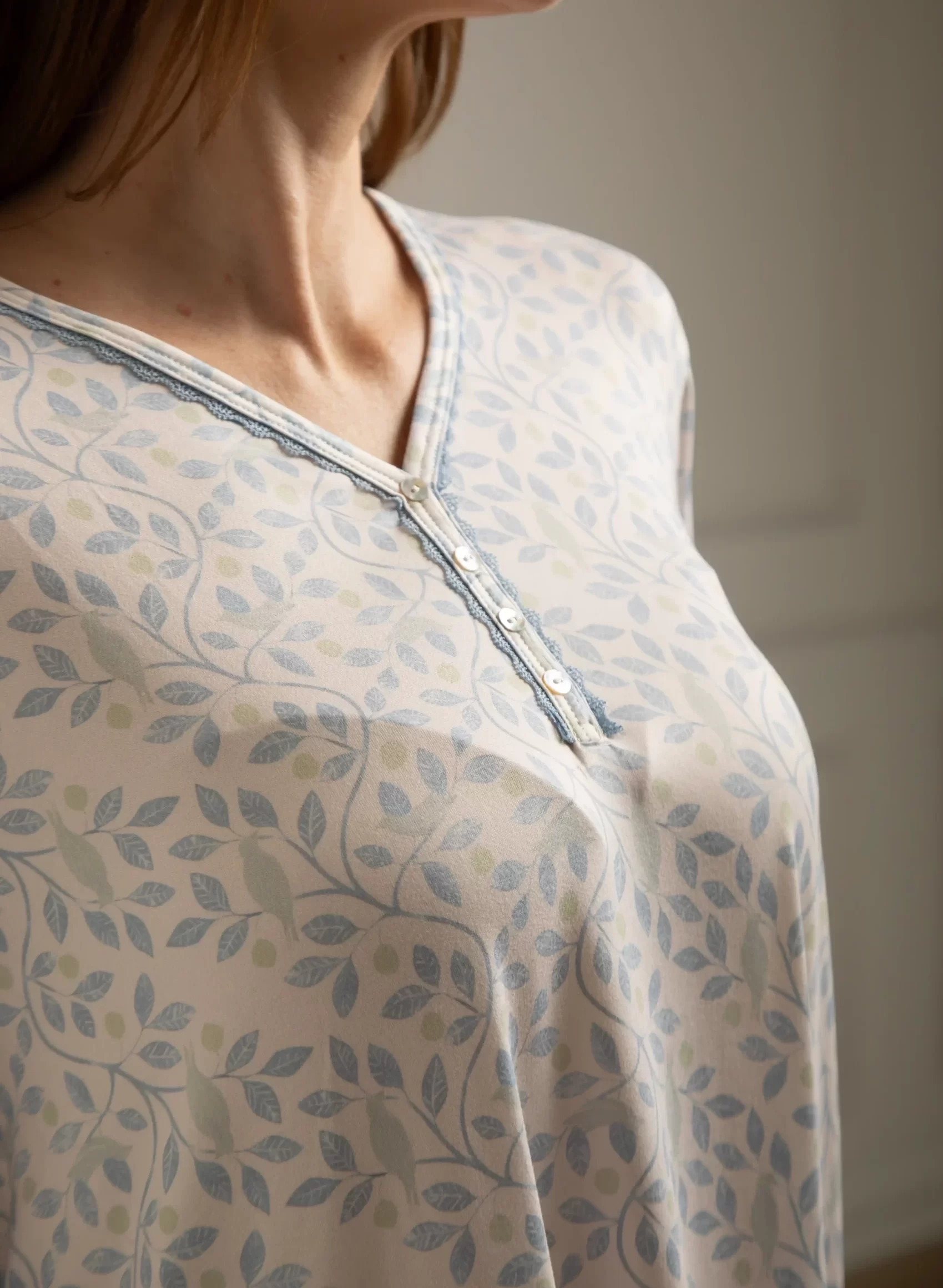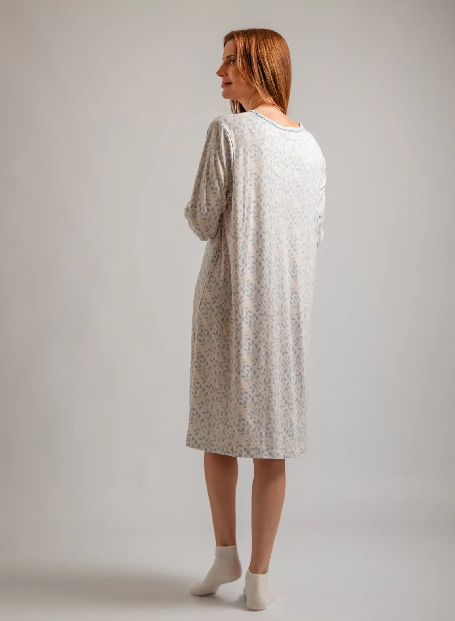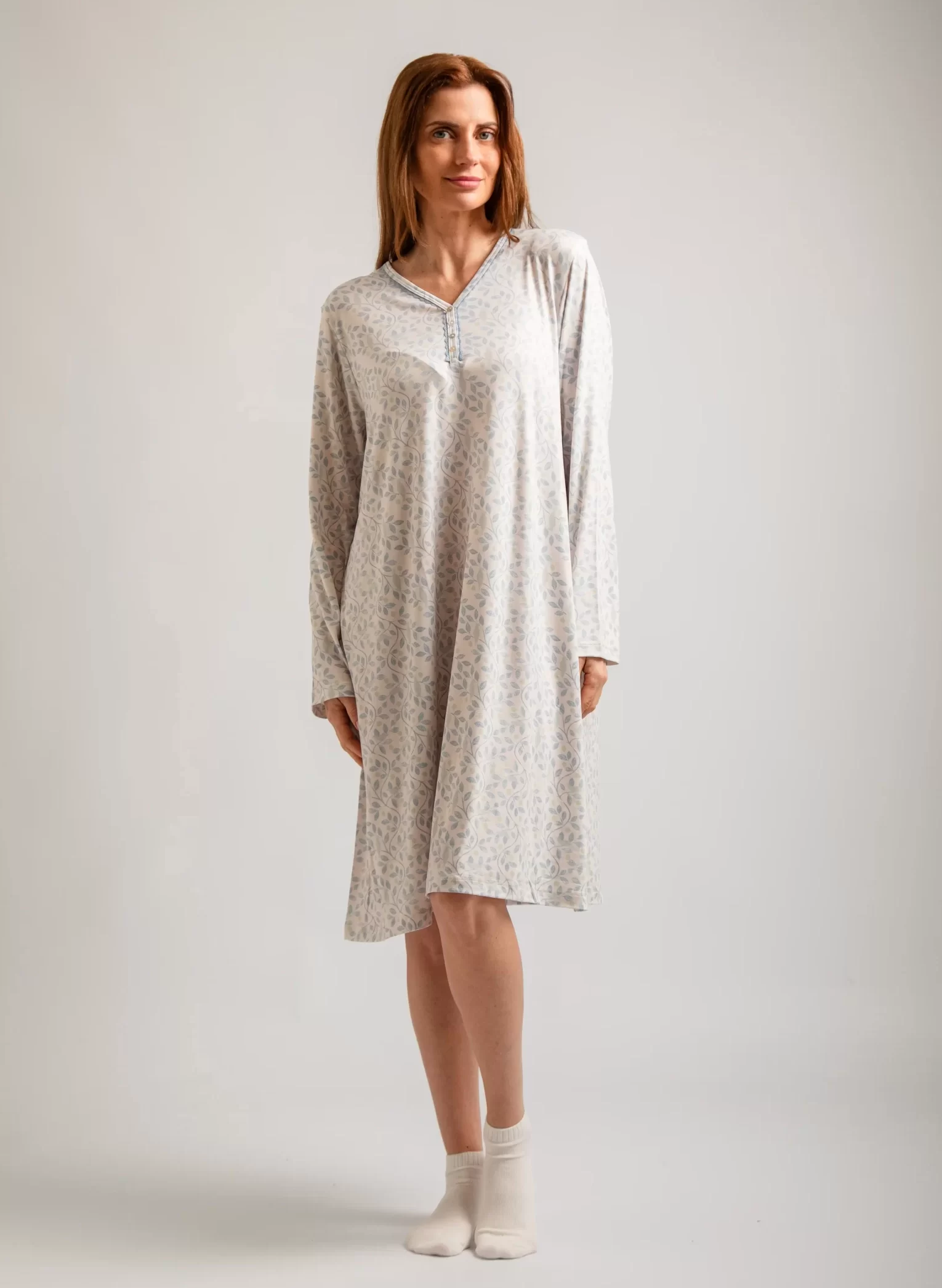 Descubre nuestro Camisón de manga larga, confeccionado en suave piel de durazno, te envuelve en una calidez ligera y acogedora. Su diseño holgado luce un variados estampados, mientras que el cuello con escote en V con práctica apertura de botones en el pecho añade un toque clásico y femenino.