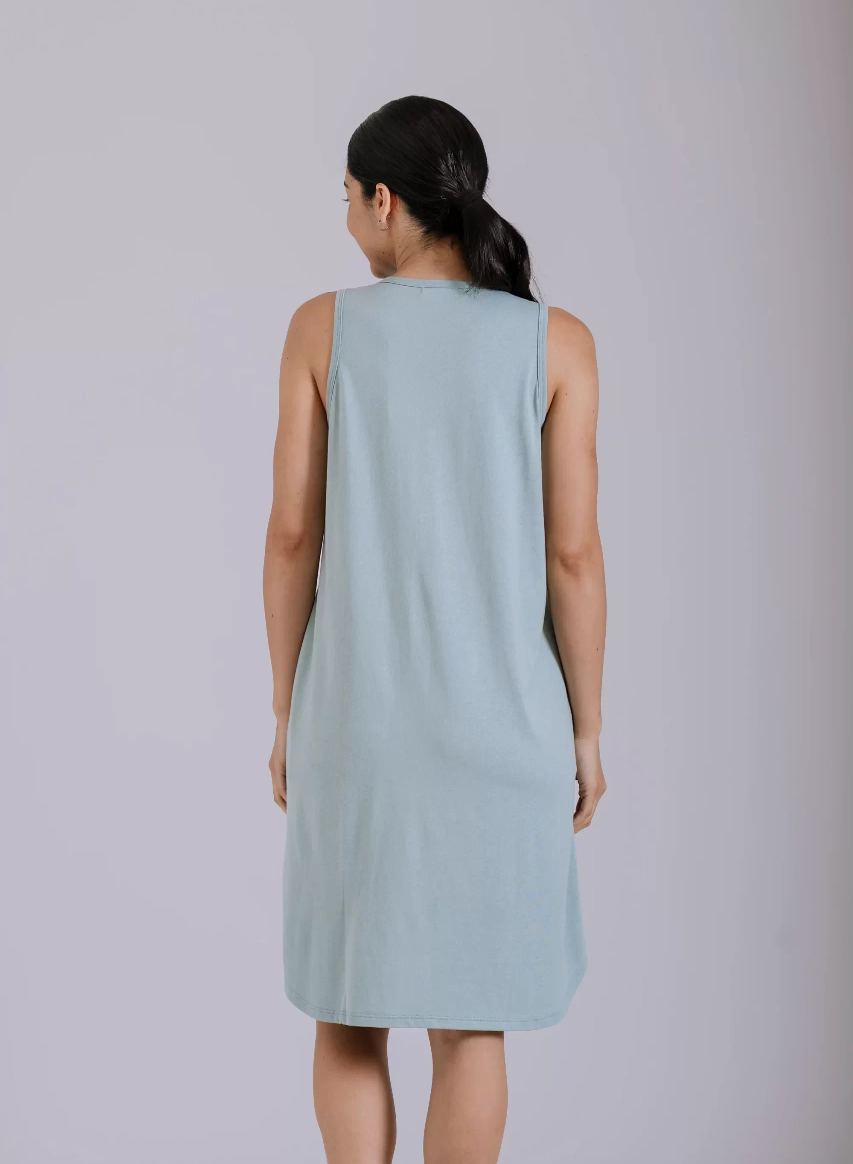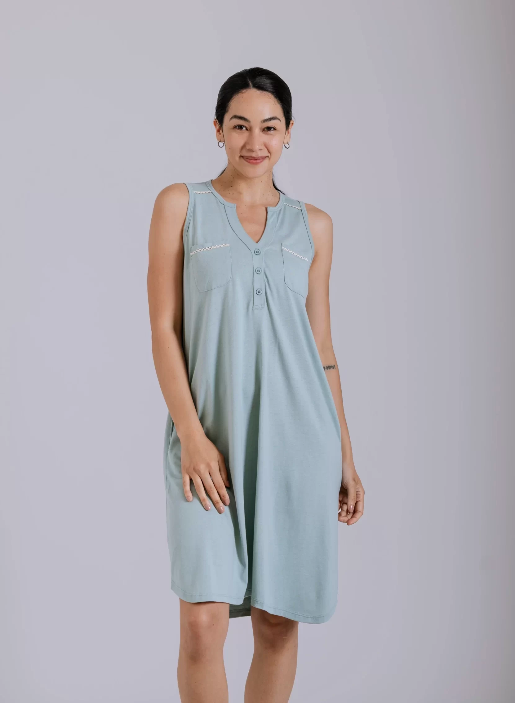 Nuevo camisón de verano manga cero, con un cuello en V que estiliza y dos bolsillos delanteros decorativos que le añaden un toque moderno. Confeccionado en pima modal, es suave y ligero. Disponible en dos colores de verano.