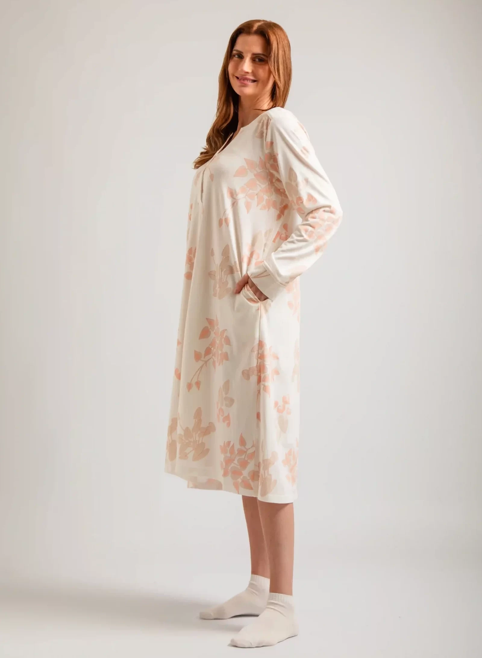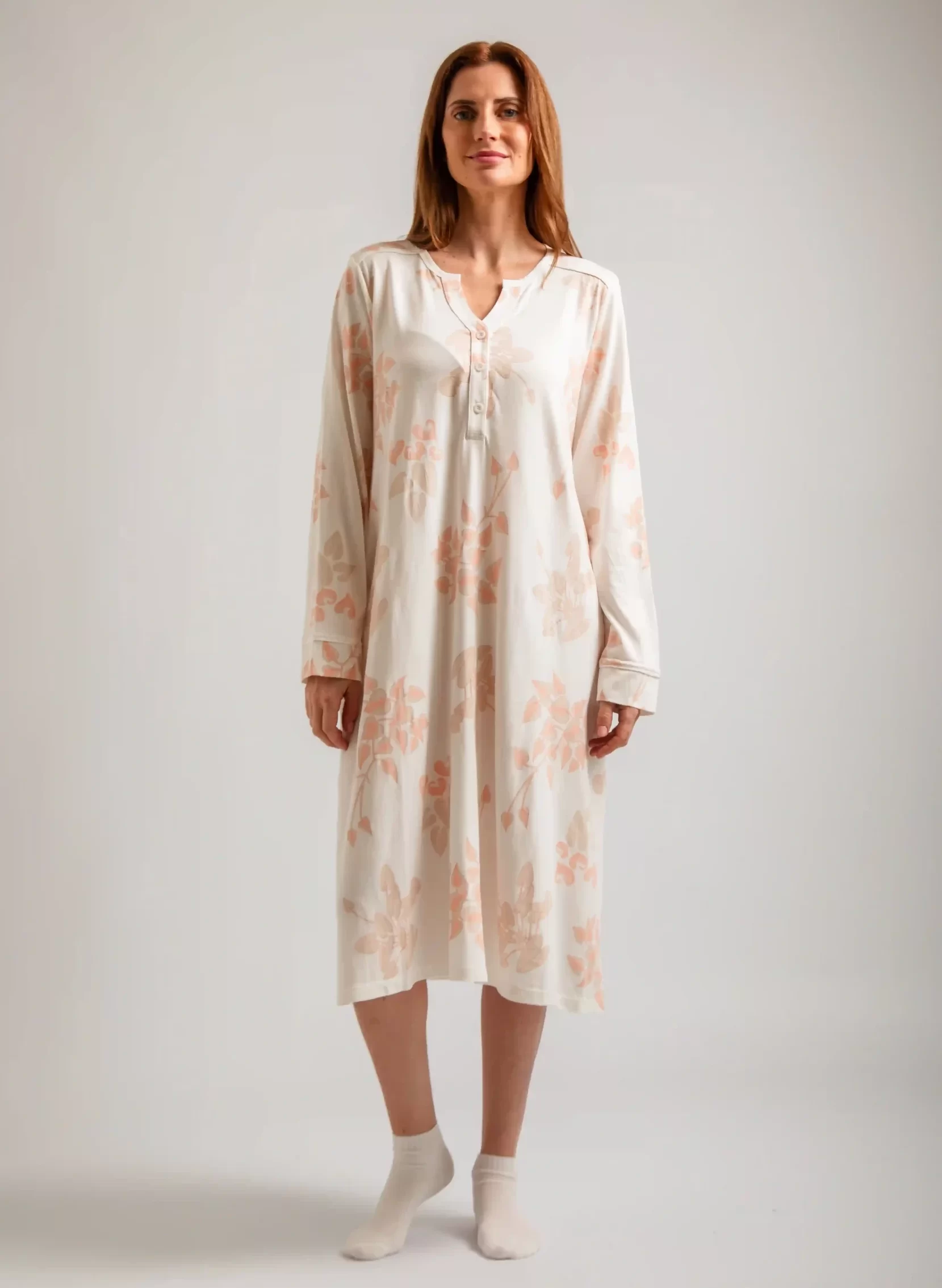 Descubre la máxima suavidad y elegancia con el nuevo camisón estampado, confeccionado en una exquisita mezcla de algodón Pima y Modal. De manga larga, con bolsillos laterales y con un lindo cuello semival con un sutil ribete, cuenta con una práctica abertura de botones para mayor comodidad. Su corte recto y fluido, junto al delicado estampado, realza una silueta feminina y confortable. Disponible en este y otros bellos diseños que te encantarán.