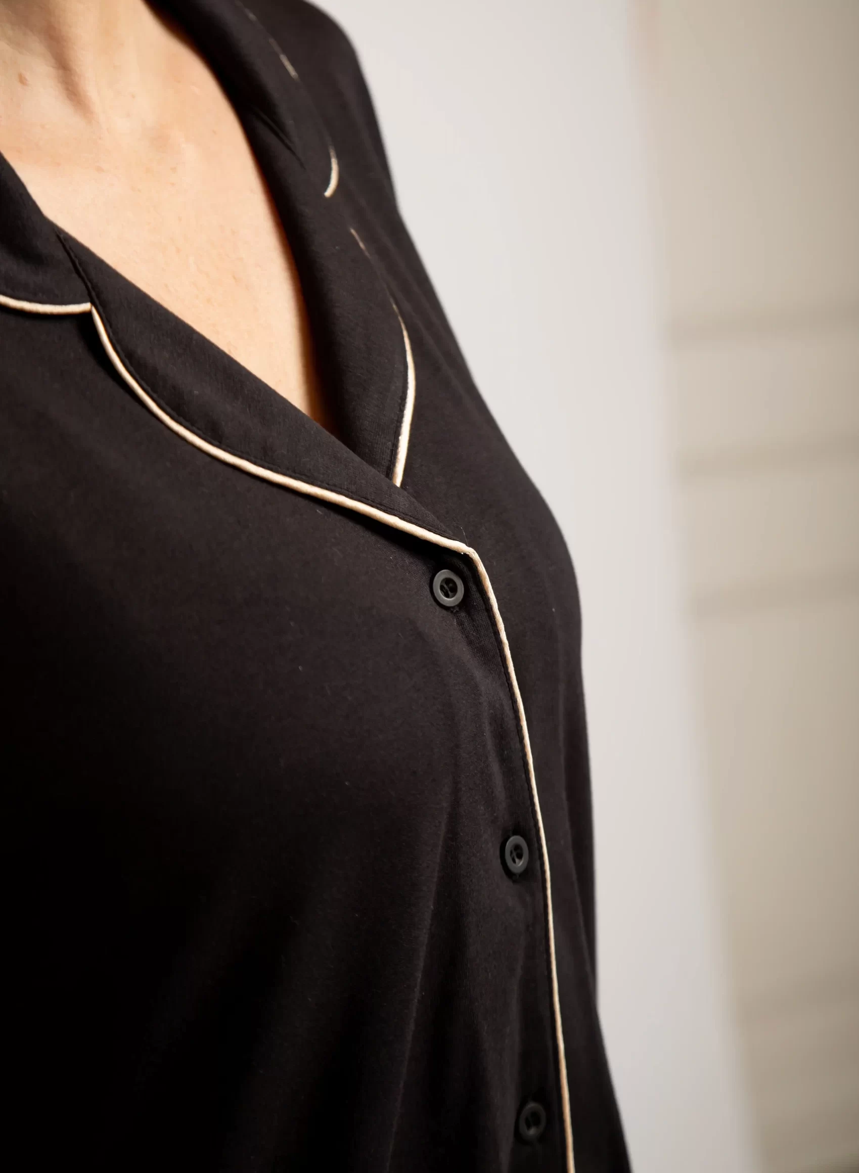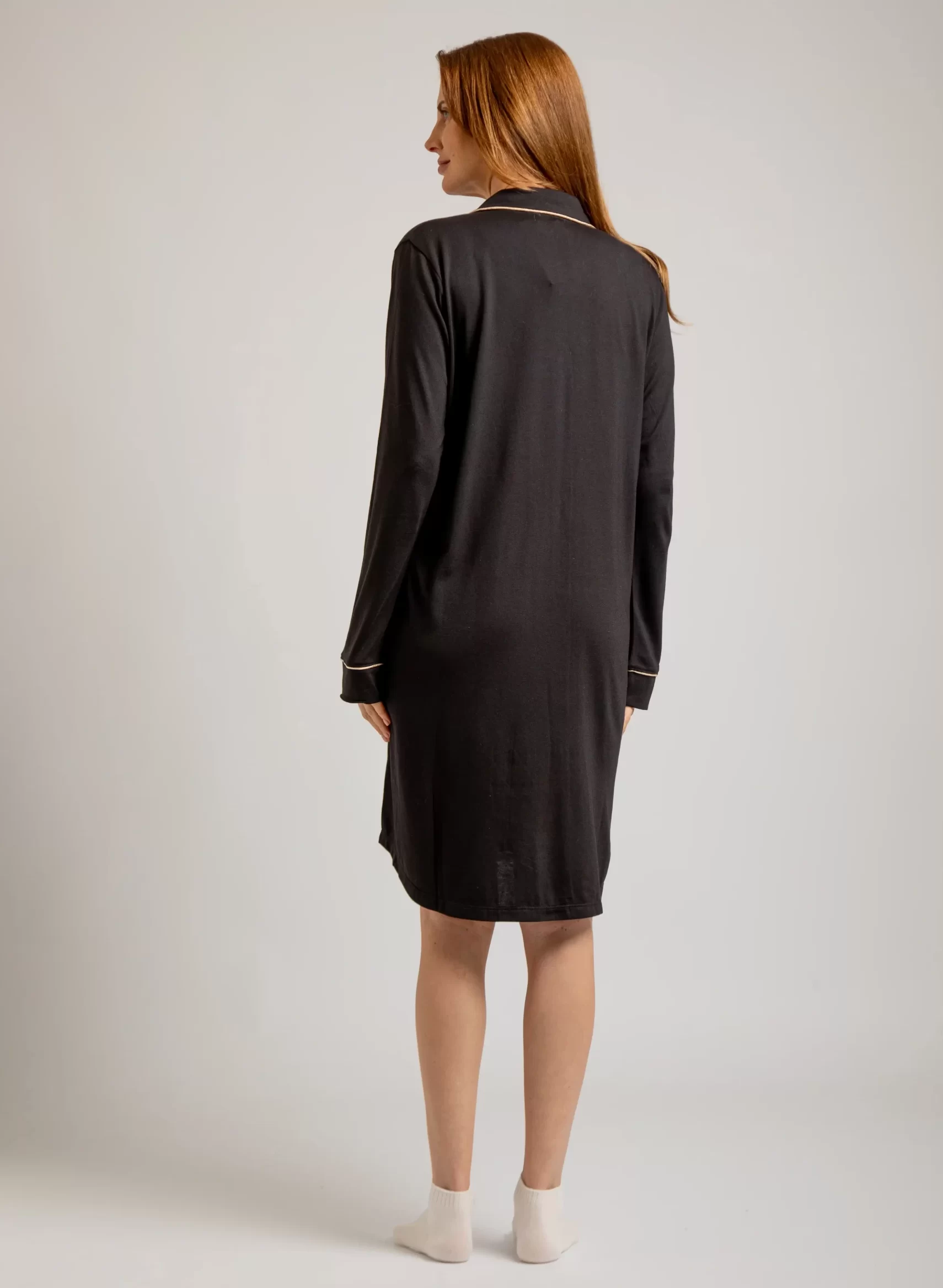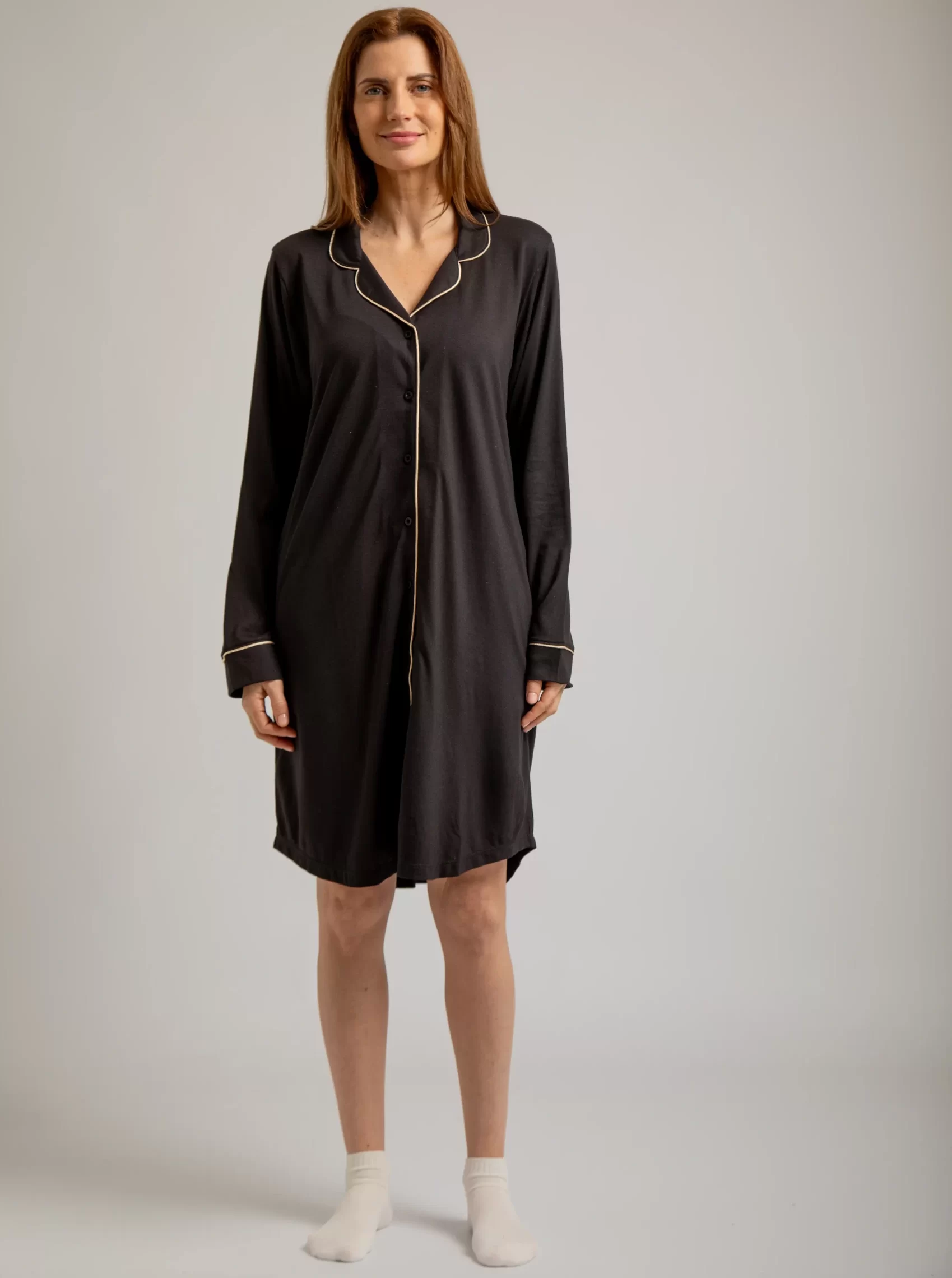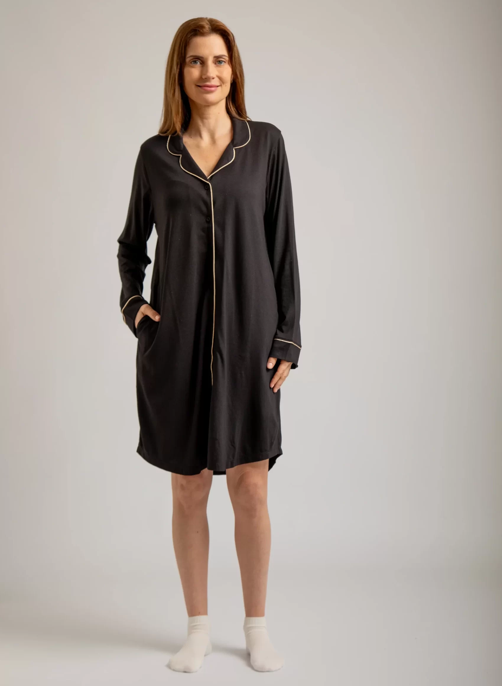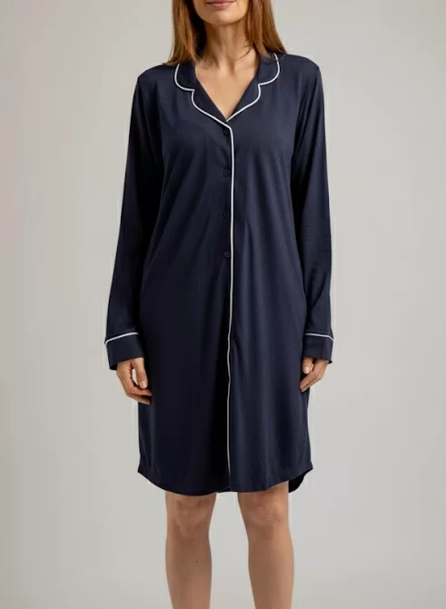 Camisón Abierto de Pima Modal. Confeccionado con una mezcla de algodón Pima, reconocido por su suavidad y Modal, fibra de origen natural que aporta ligereza y frescura, esta prenda envuelve tu piel en una sensación de confort. Su diseño tipo camisero, de manga larga y cuello elegante, incorpora delicados ribetes que añaden un brillo sutil y un toque de distinción. La apertura completa con botones ofrece máxima practicidad y cuenta con bolsillos laterales.
