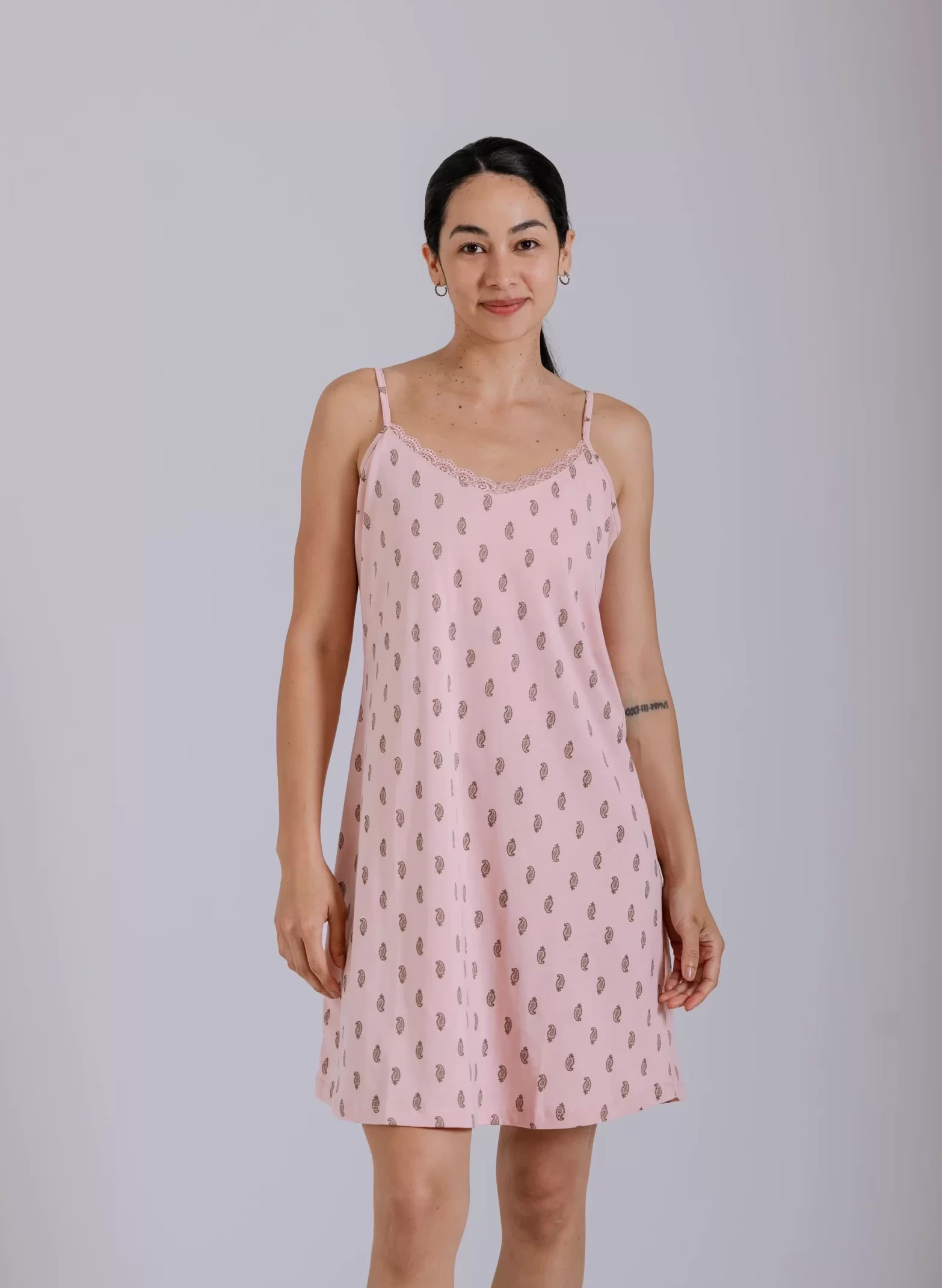 Pijama elaborado en 100% algodón pima peruano, reconocido mundialmente por su suavidad natural, durabilidad, propiedades hipoalergénicas y frescura ligera. Camisola de tiras delgadas y regulables, con detalle de blonda en el escote.