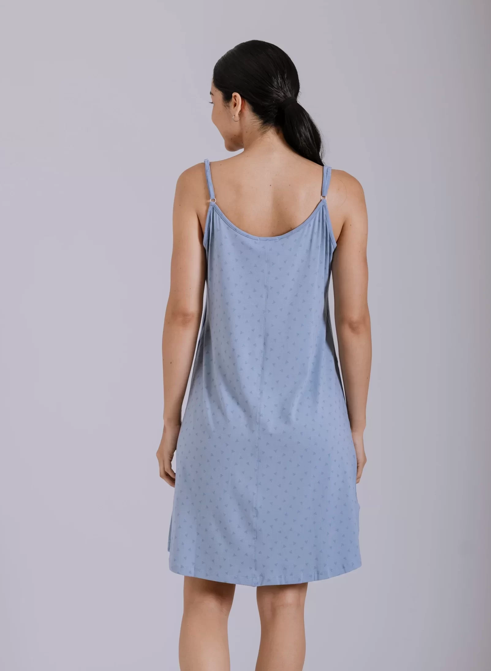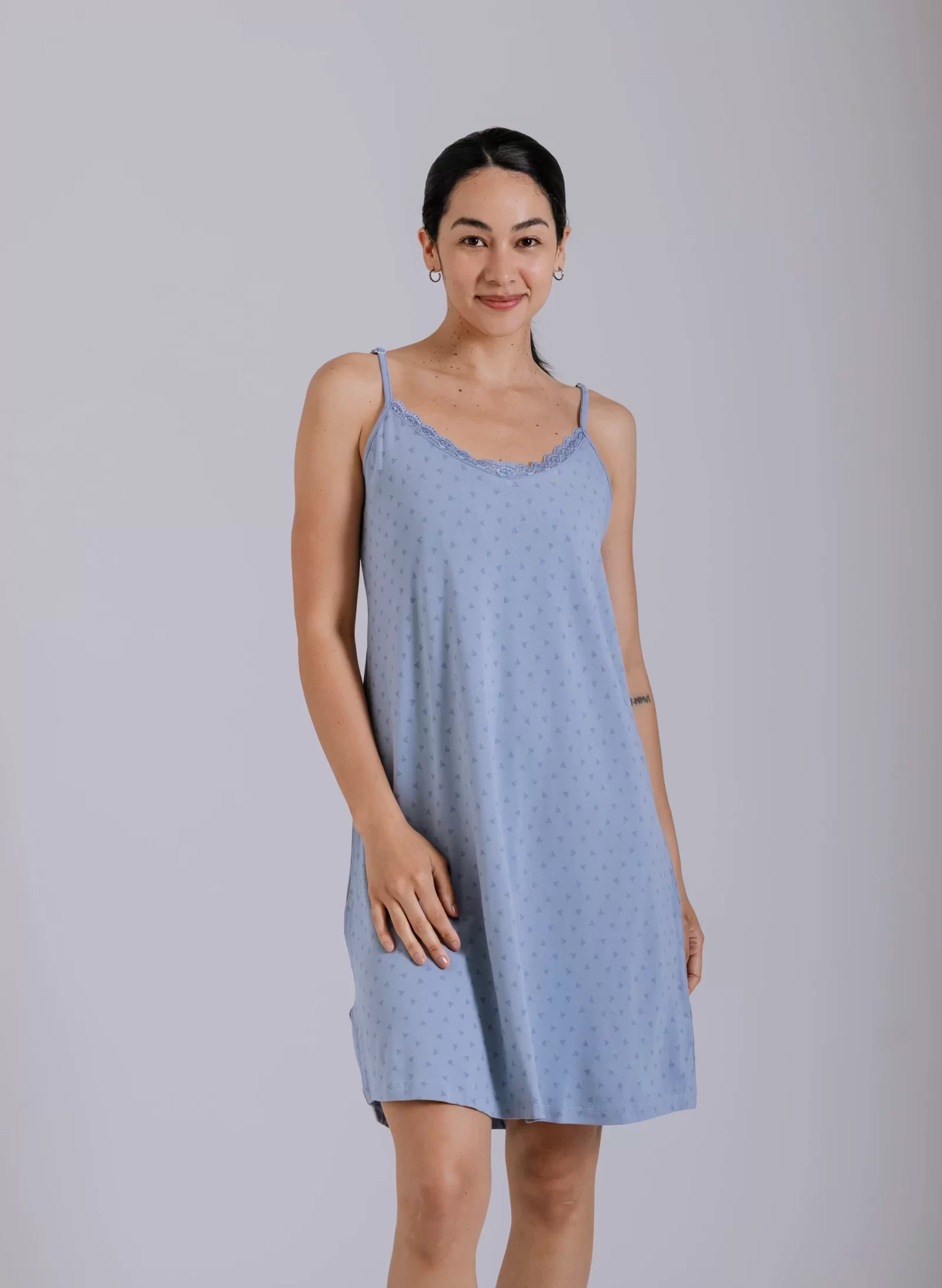 Nuevo camisón de verano confeccionado en viscosa suave y fresca, con un modelo estampado. Cuenta con tiras regulables para un ajuste personalizado y una delicada blonda en el cuello.