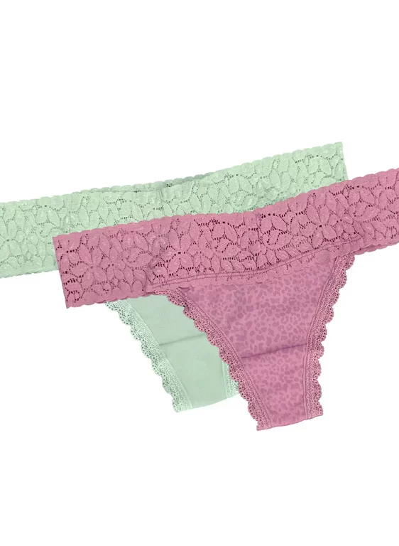 Nuevo Pack x2 de Hilos Disfruta de este pack de dos hilos en color rosa y verde menta. Confeccionado en encaje floral. Su cintura ancha de encaje brinda un ajuste cómodo.