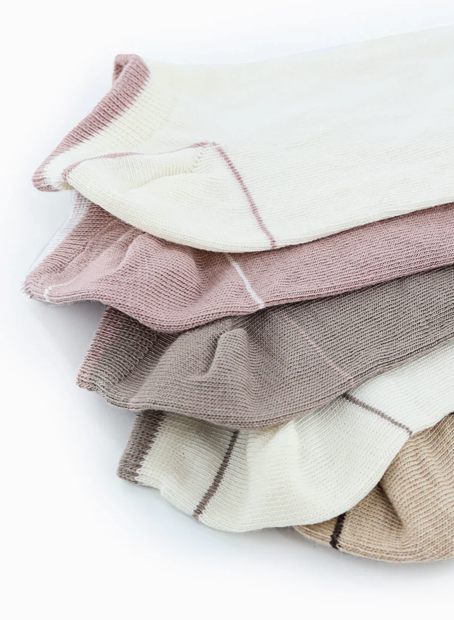 Media hecha en algodon, diseño rib. Corte tobillero, ideal para uso casual o deportivo. Pack incluye 5 pares de medias de colores surtidos. Talla unica de 36-39 de calzado.