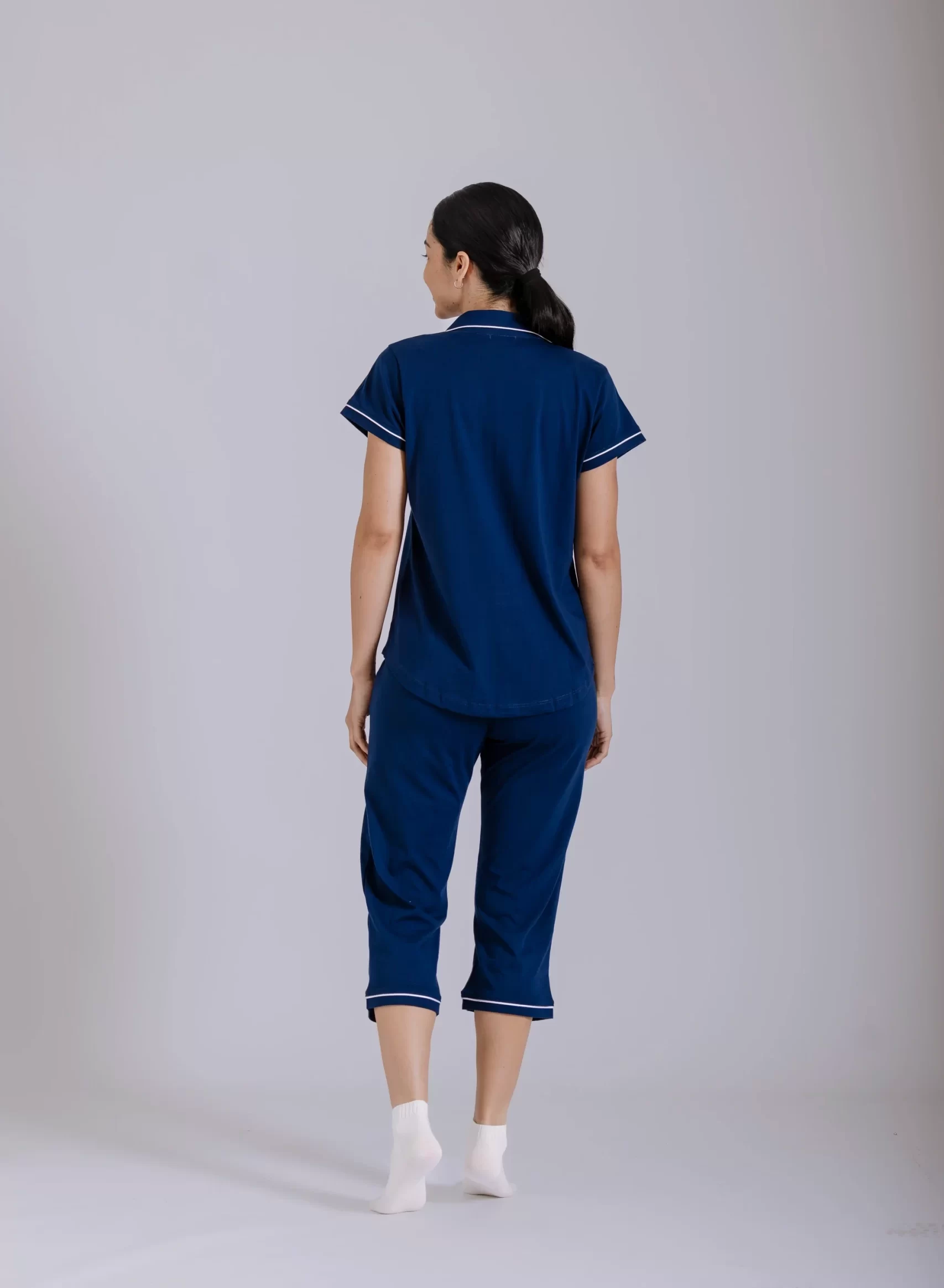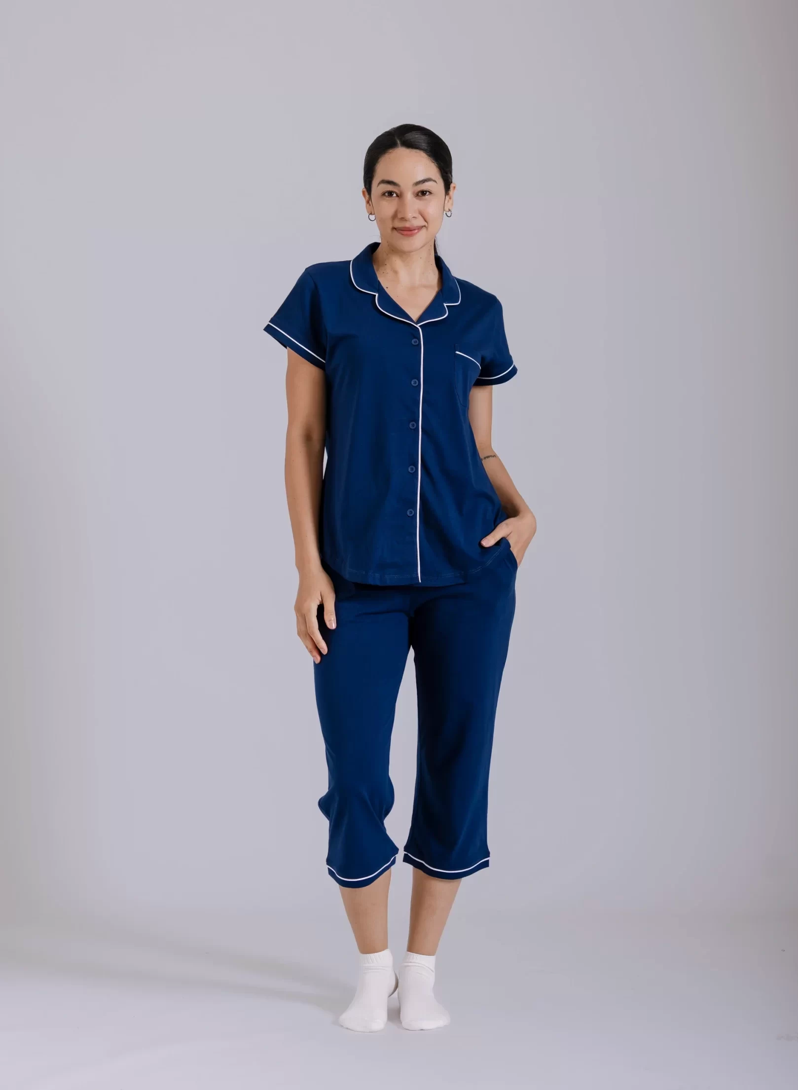 Pijama confeccionado en 100% algodón pima peruano premium. Usamos el algodón pima de la mejor calidad para asegurarte mayor suavidad y durabilidad. Pantalón corte capri, debajo de la rodilla. Polo estilo camisa, con botones.