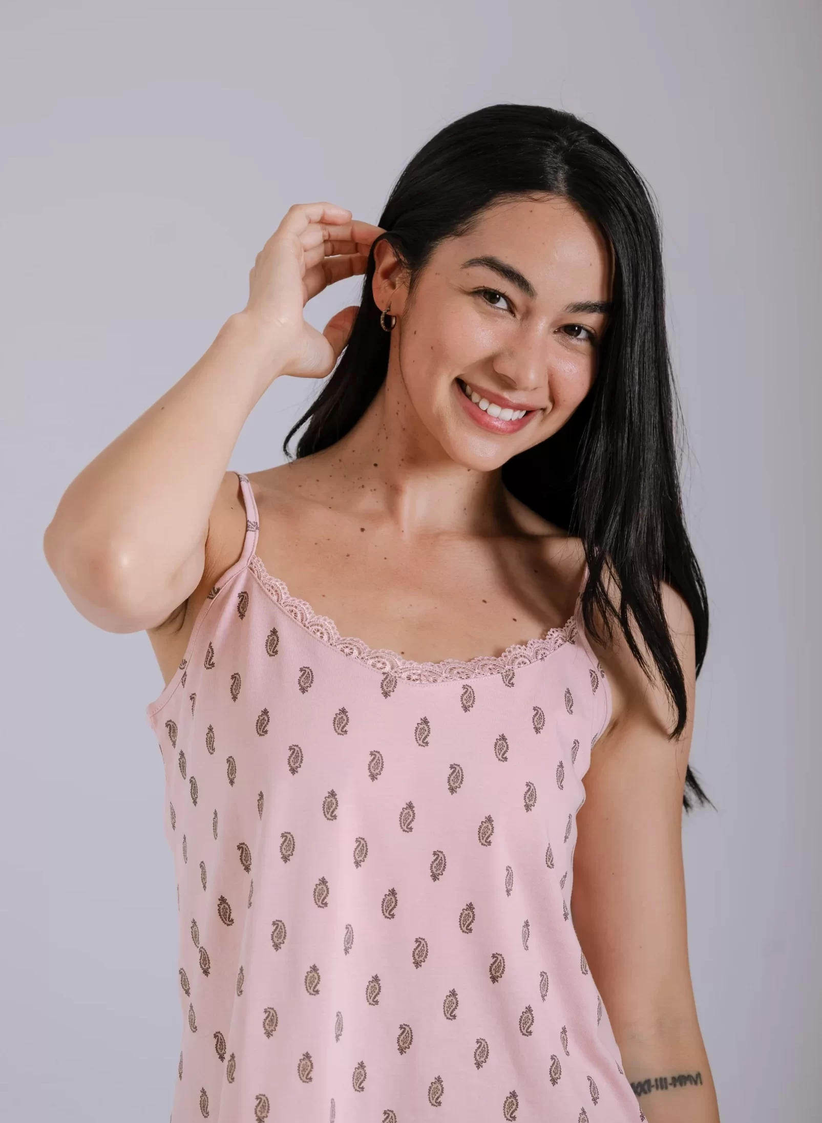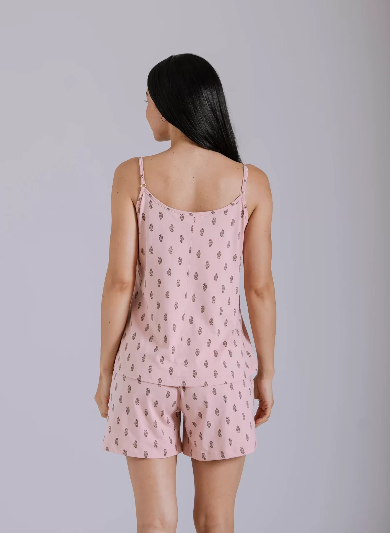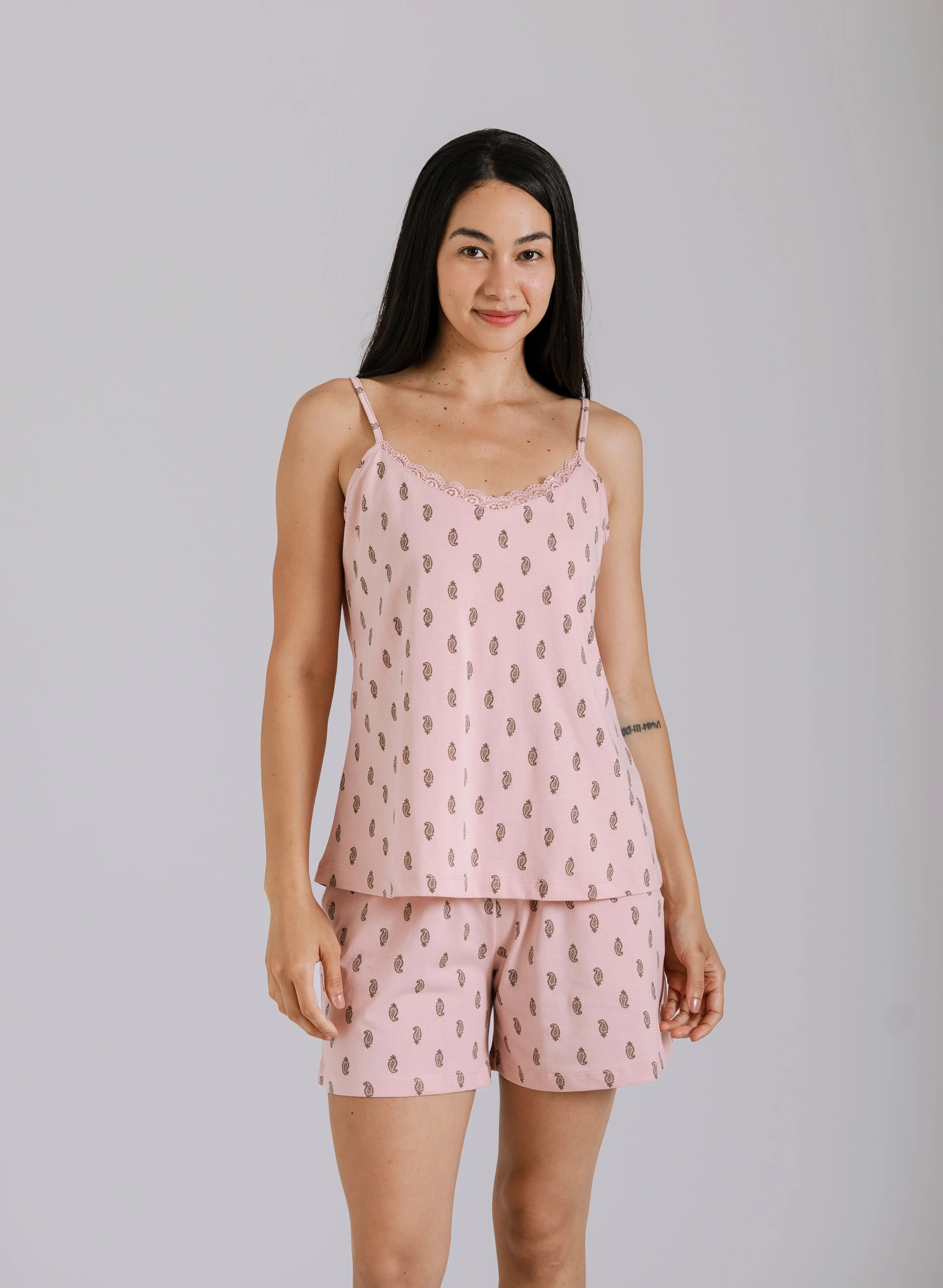 Pijama elaborado en 100% algodón pima peruano, reconocido mundialmente por su suavidad natural, durabilidad, propiedades hipoalergénicas y frescura ligera. Camiseta de tiras delgadas y regulables, con detalle de blonda en el escote. Short con pretina suave y bolsillos laterales. Estampado sutil en ambas piezas.