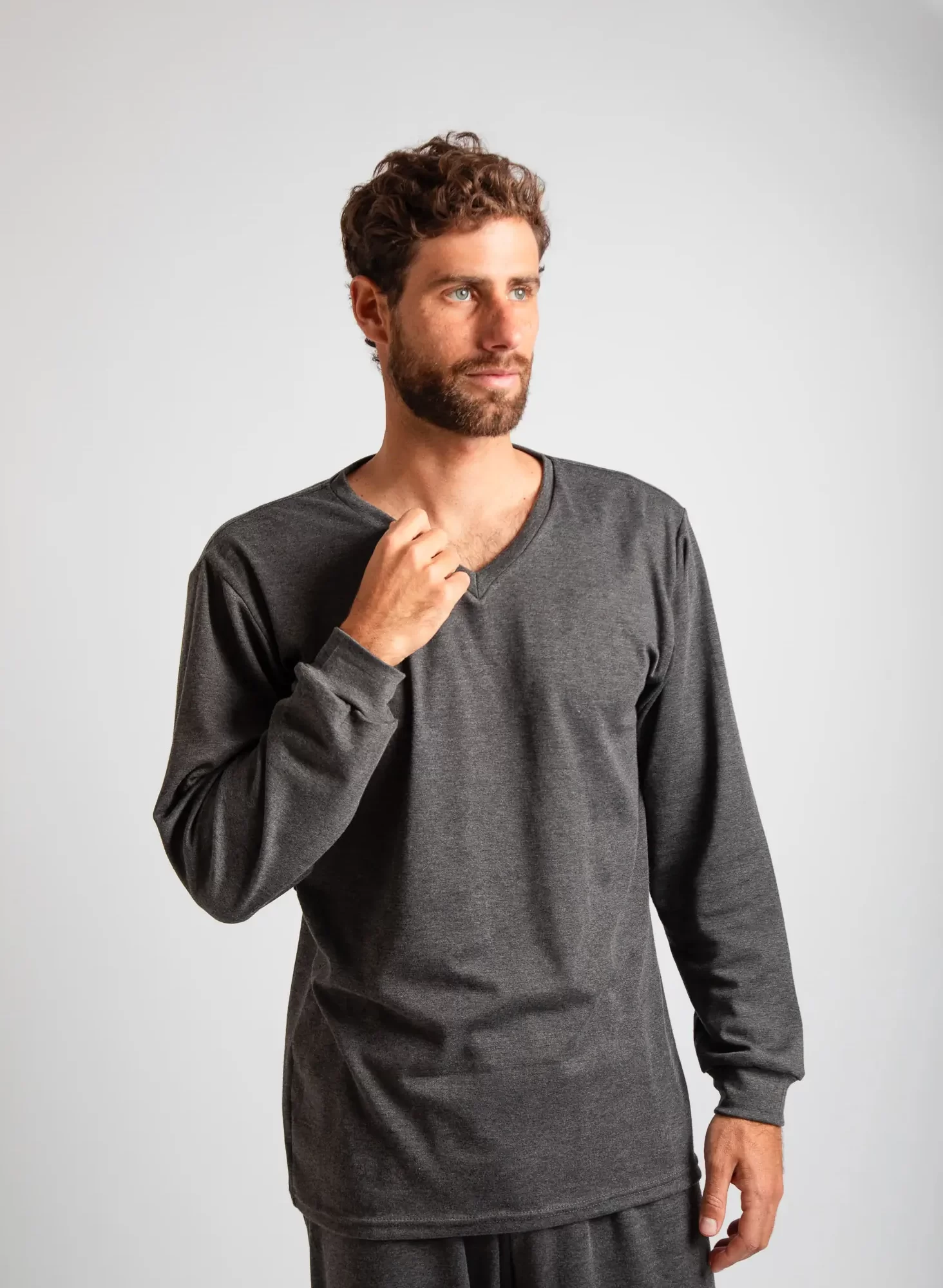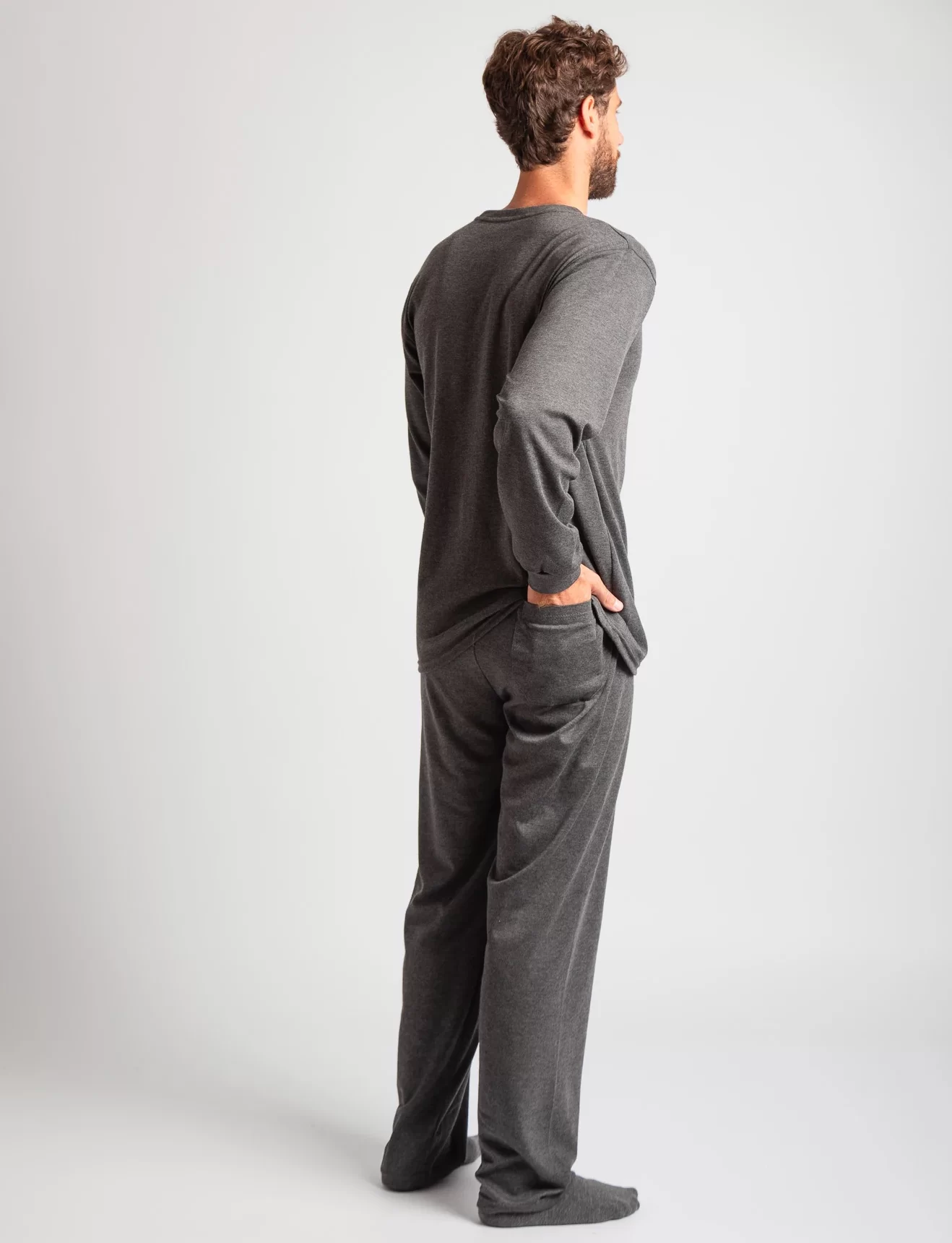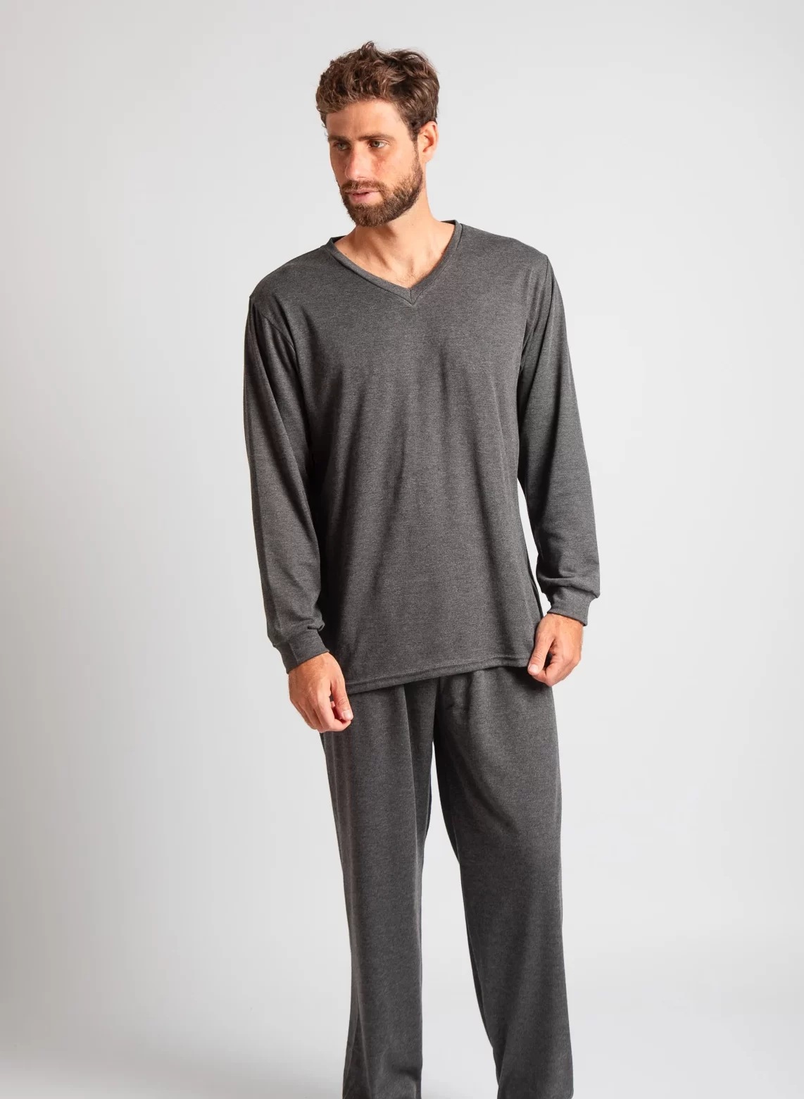 Pijama de dos piezas para hombre, compuesto por un polo de manga larga en cuello en V y delicado acabado en las mangas, acompañado de un pantalón con bolsillos que brinda comodidad y practicidad.