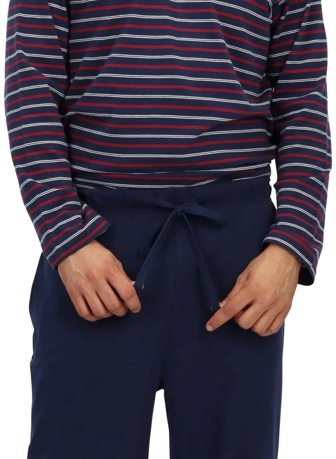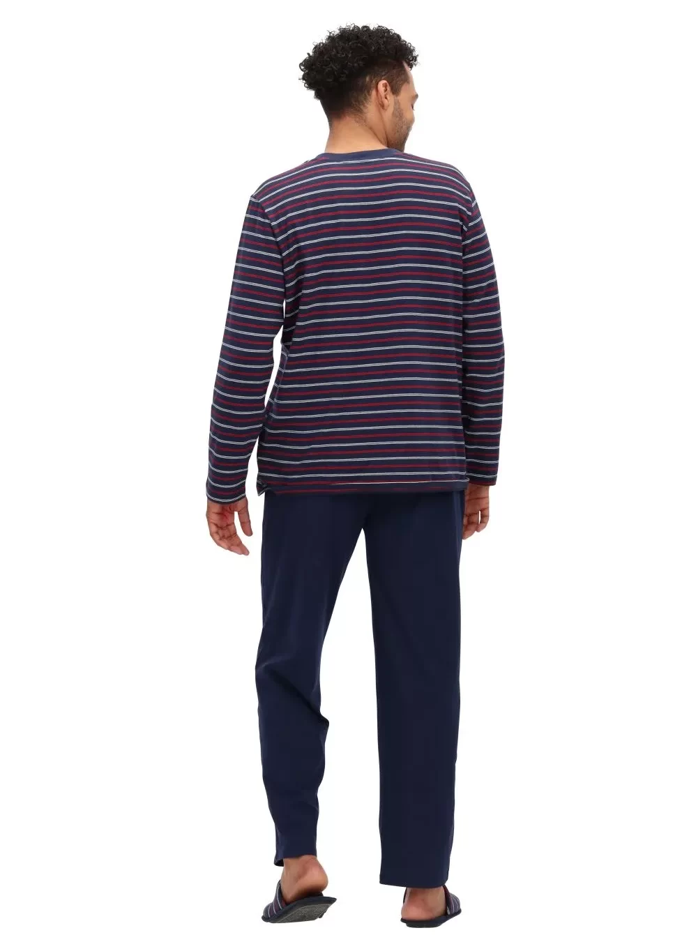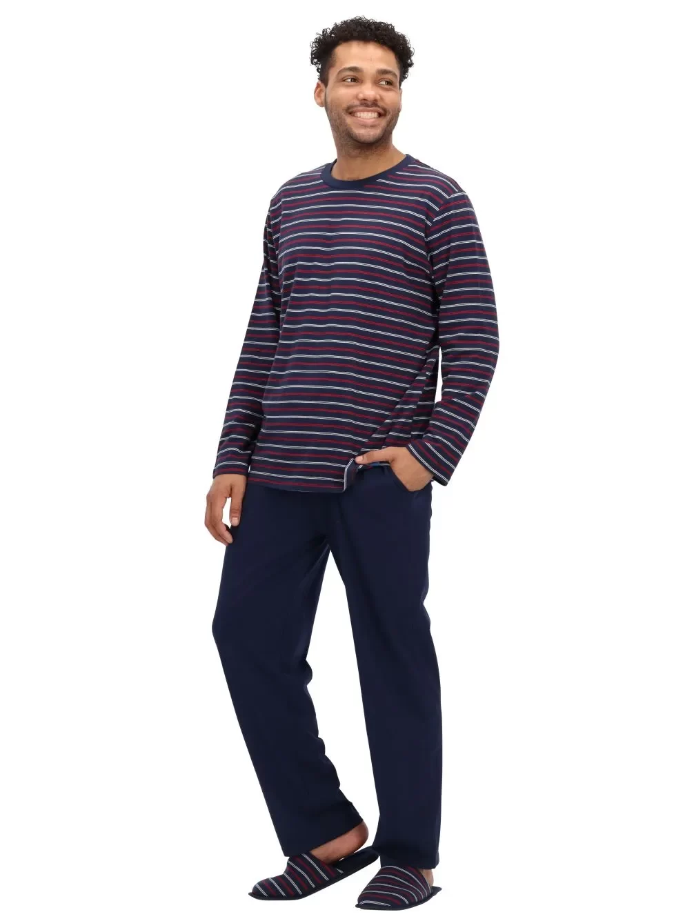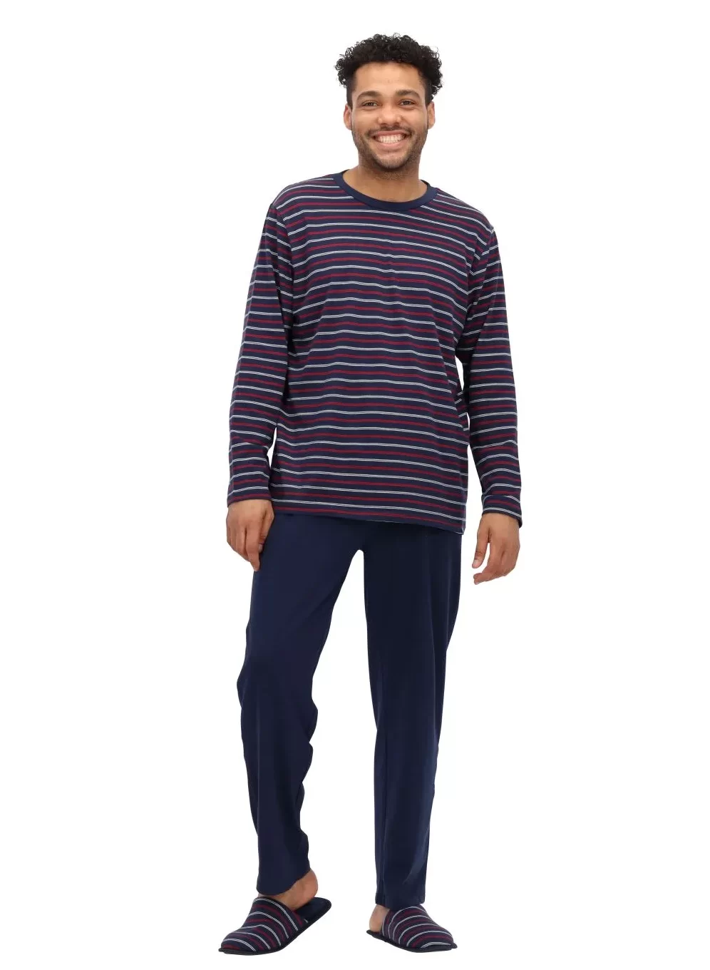 Descubre el confort y el estilo con nuestro nuevo Pijama. El polo de manga larga, con un clásico diseño de rayas en azul marino y rojo, se combina a la perfección con un pantalón azul entero de corte cómodo, con bolsillos laterales y cintura ajustable. Para completar la experiencia, incluye unas suaves pantuflas a juego, pensadas para que disfrutes de una comodidad total de pies a cabeza.