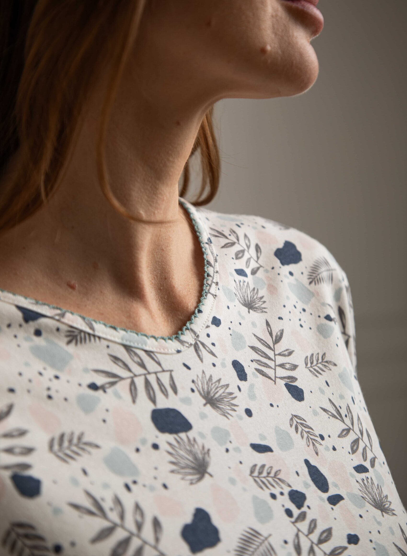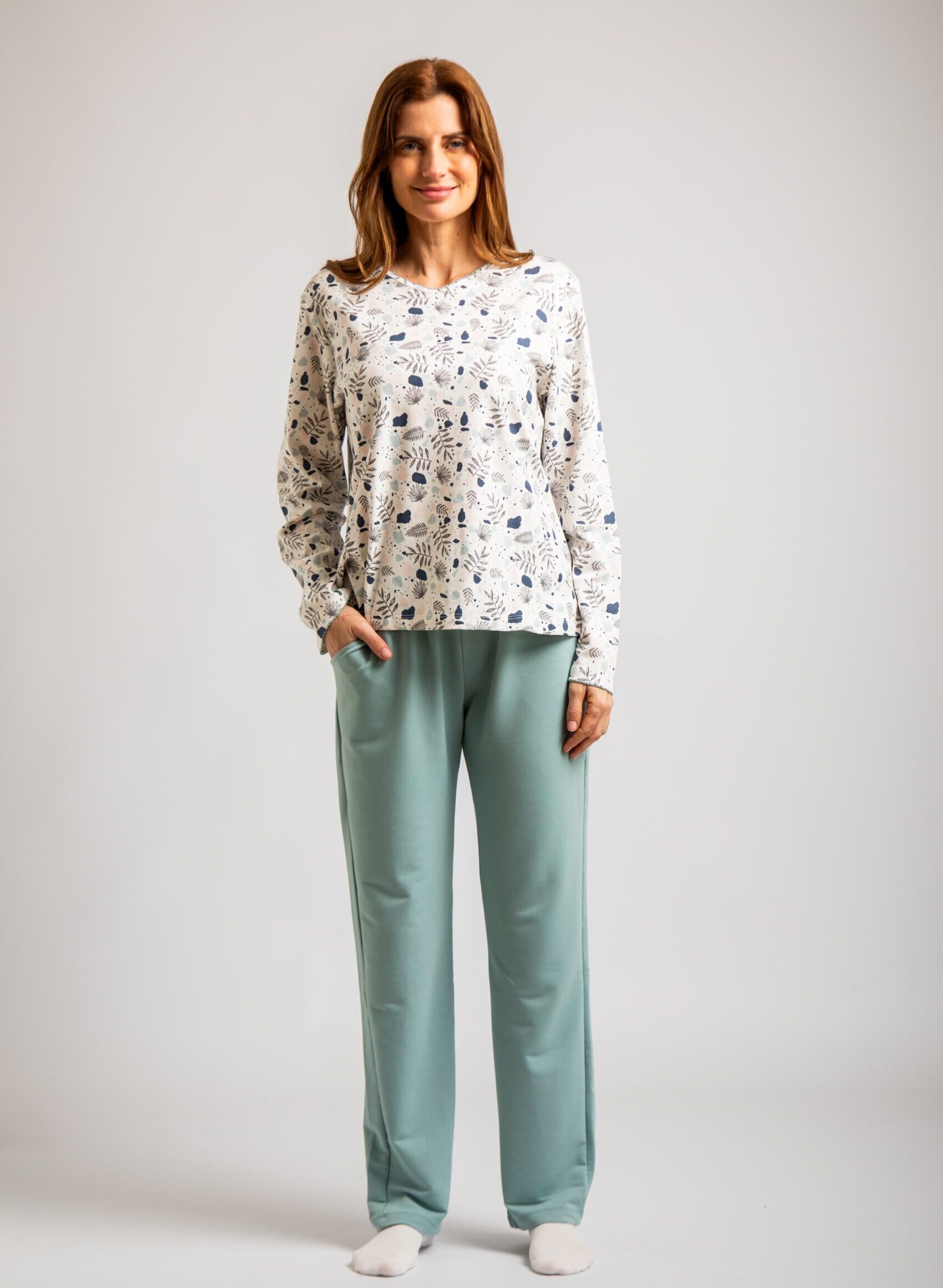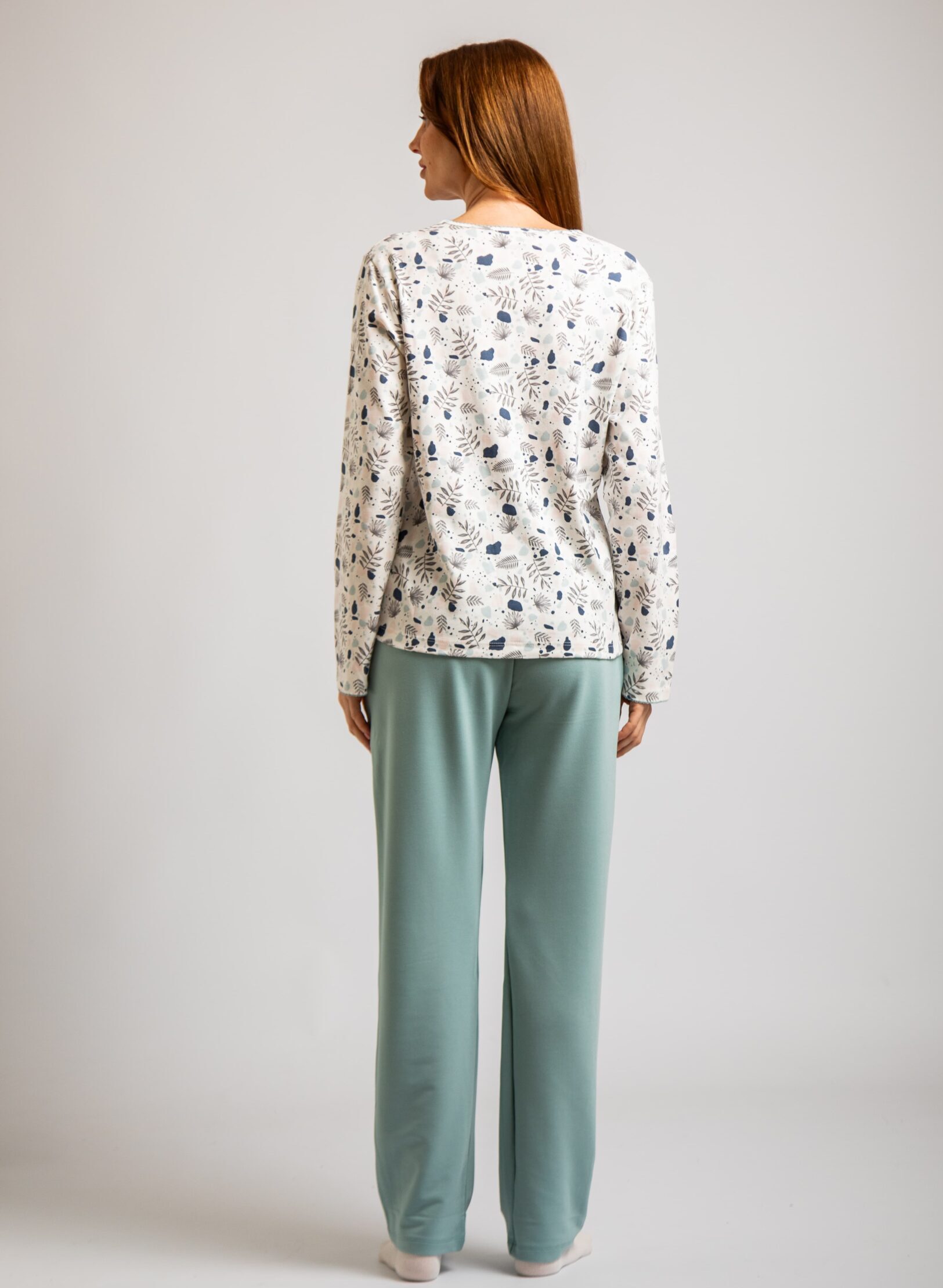 Disfruta de la suavidad y el estilo de nuestro Pijama de Algodón, un conjunto pensado para brindarte máximo confort en tus momentos de descanso. El polo de manga larga, con delicado cuello en V adornado con sutil blonda y un fresco estampado de hojas en tonos suaves, se combina con un pantalón liso confeccionado en suave tejido French Terry, de corte cómodo y con prácticos bolsillos laterales. Ideal para relajarte en casa con total comodidad.