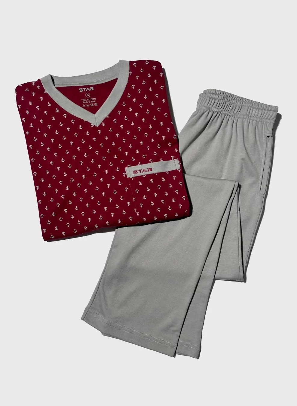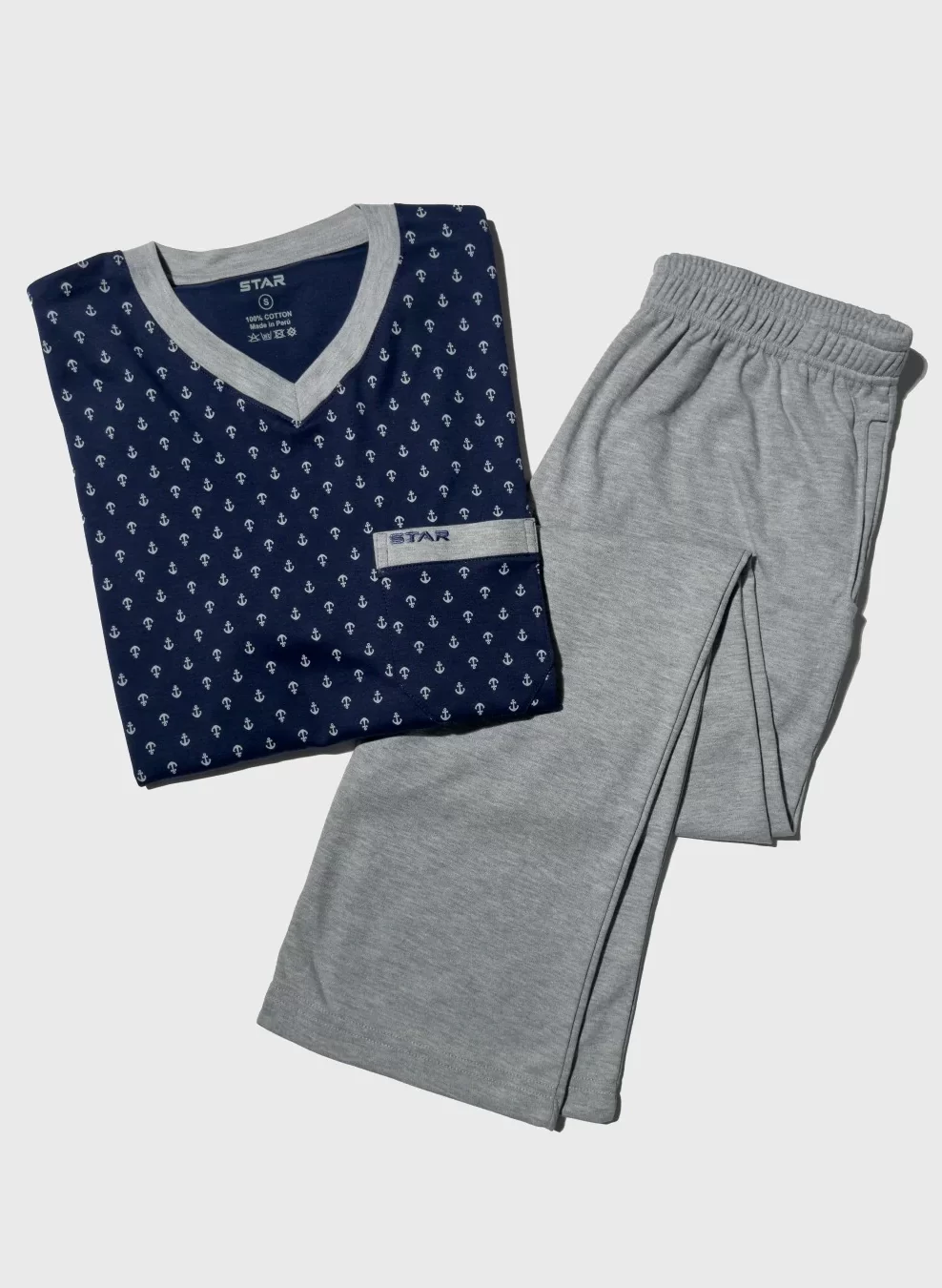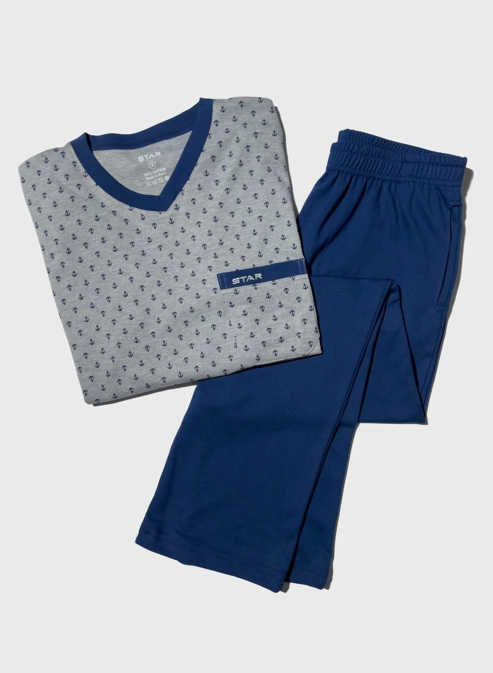 Pijama de algodón para hombres. Incluye polo manga larga y pantalón largo. El polo lleva cuello en V, bolsillo delantero con el logo de la marca y con estampado. El pantalón es de color entero con bolsillos laterales, ideal para mayor funcionalidad sin perder comodidad.