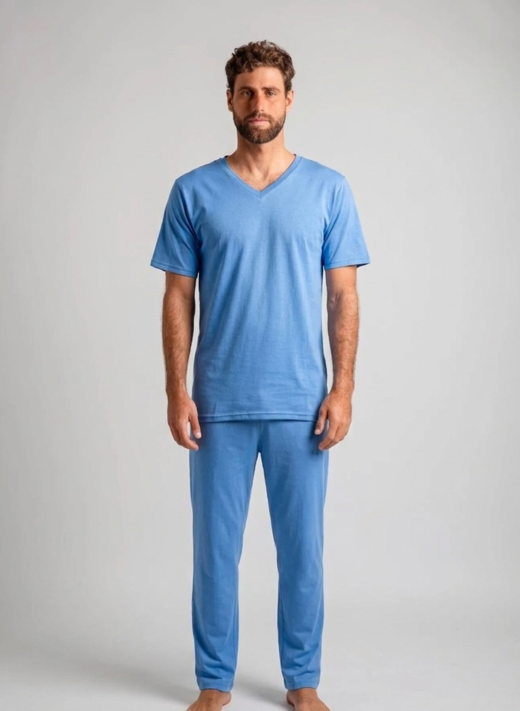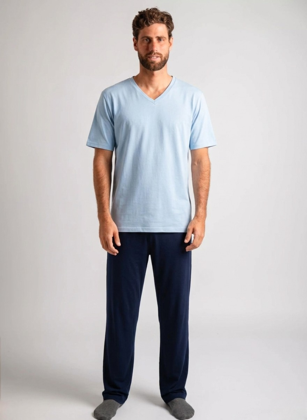 Pijama en algodón peruano. Polo manga corta + pantalón largo. Polo con cuello V. Pantalón con bolsillos laterales.