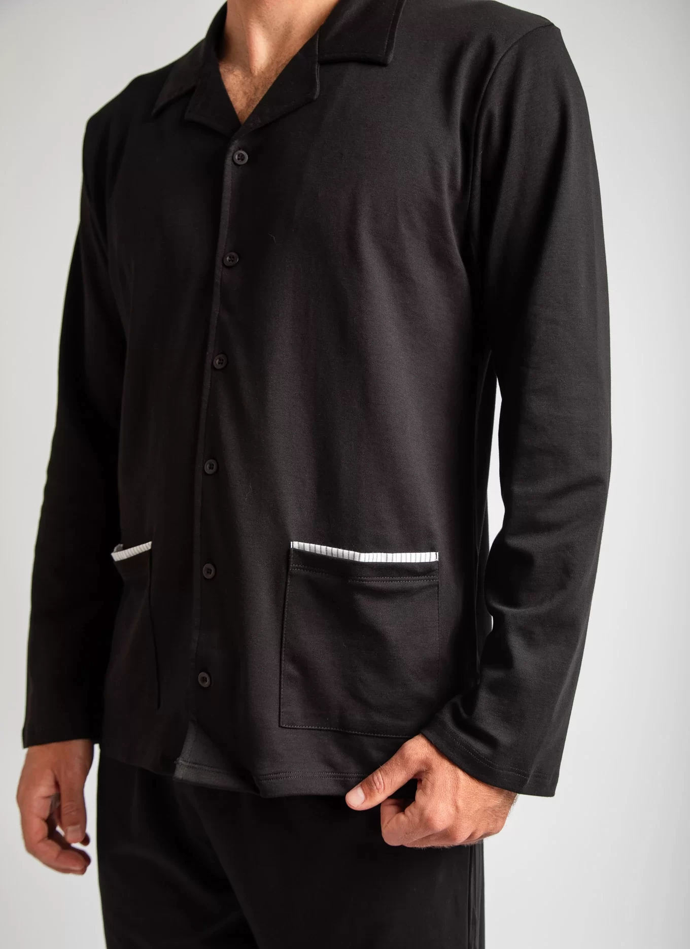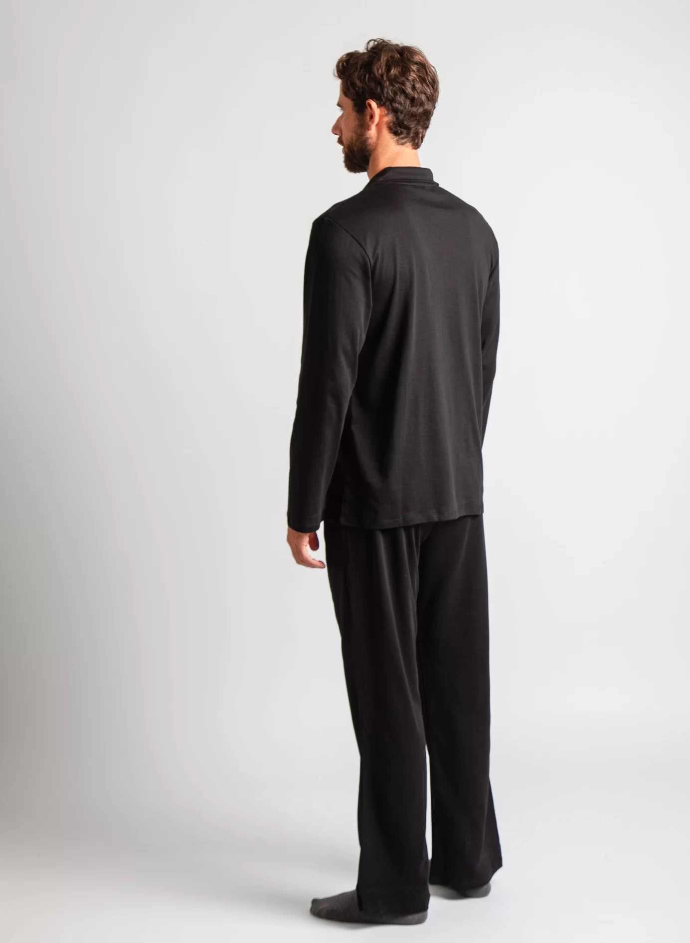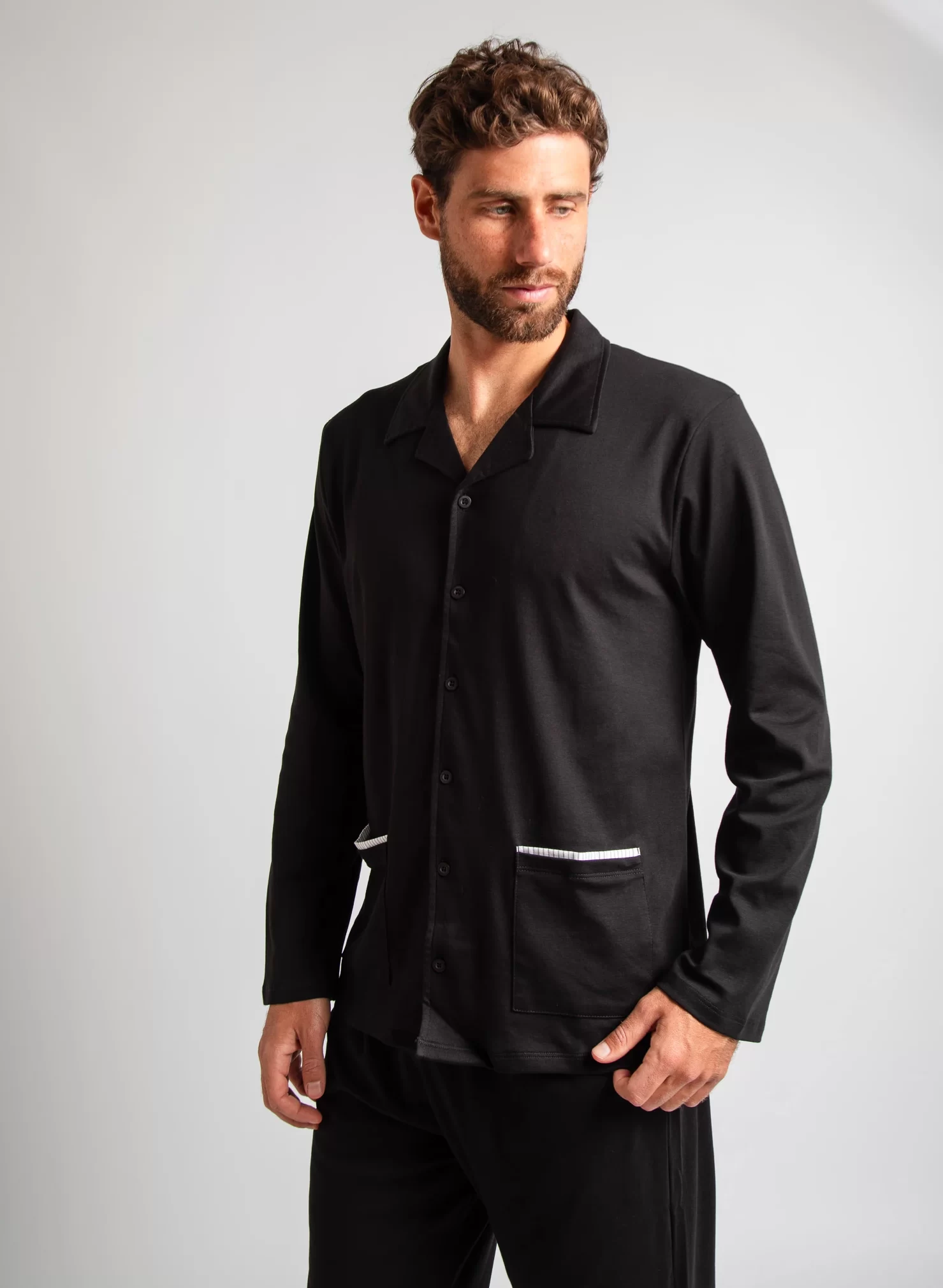 Nuestro clásico pijama de hombre en 100% algodón pima peruano premium. Perfecto para la media estación e invierno. Conjunto en polo manga larga cuello en V, con bosillo delantero y pantalón con bolsillos. Hecho en Perú.