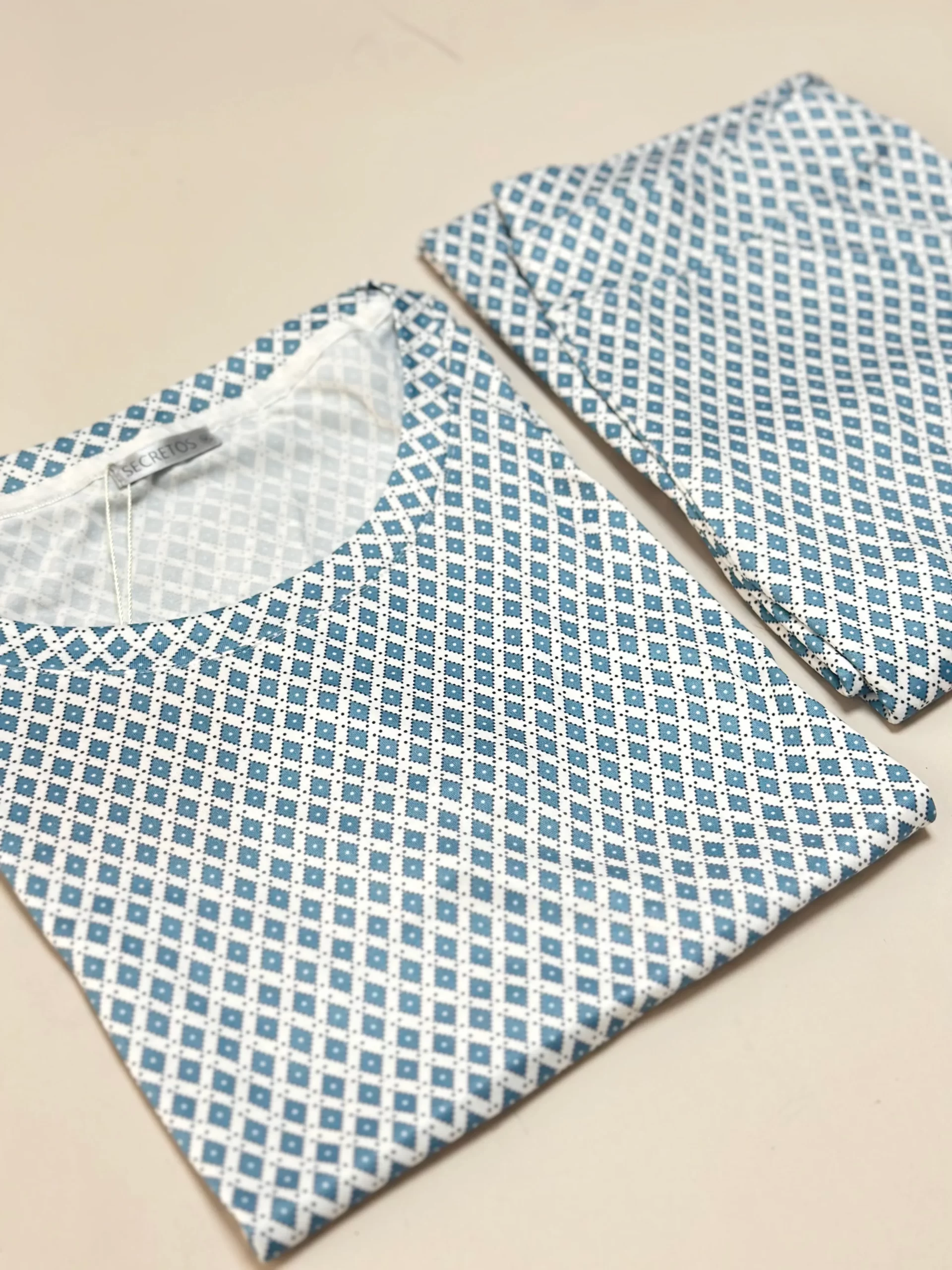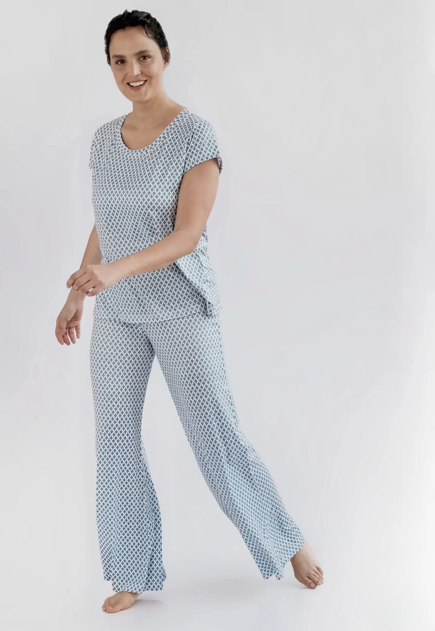 De la nueva colección de pijamas en piel de durazno, llamada así por su suavidad. Conjuntos estampados de polo en cuello redondo junto a un pantalón en corte palazo. Bolsillos laterales en el pantalón.
