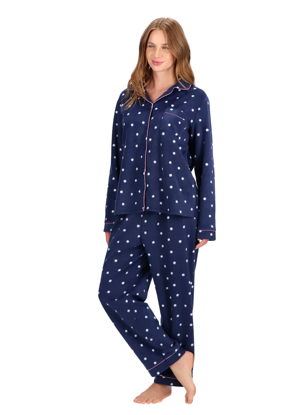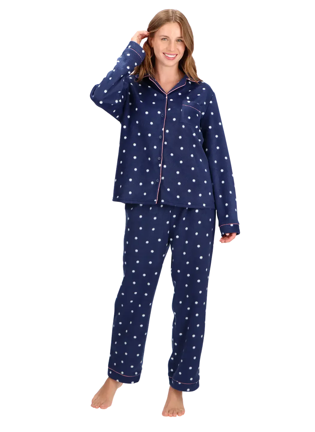 La nueva pijama de mujer para invierno, confeccionada en franela de viscosa, tiene un interior extra suave al tacto que brinda abrigo y comodidad en este invierno. El conjunto de dos piezas incluye un polo manga larga con cuello redondo junto a un pantalón con bolsillos laterales y un lazo ajustable en la cintura para un calce perfecto. . Disponible en los elegantes tonos perla y cobalto.