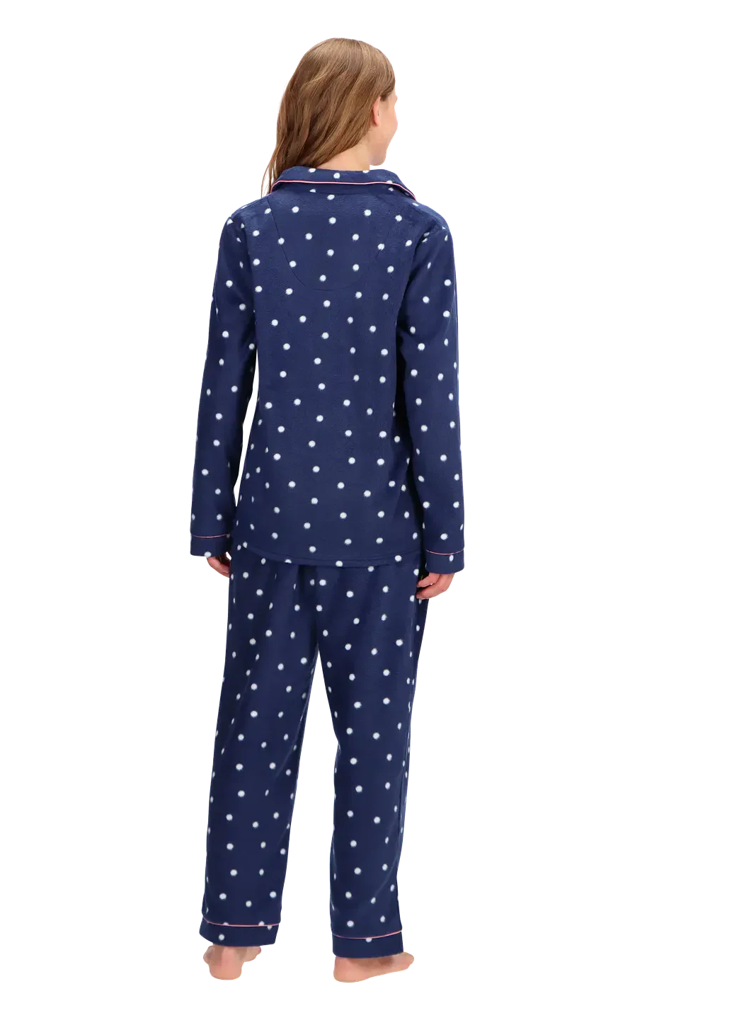 Pijama de micropolar fleece, abrigador y suave. Conjunto estilo polo largo con cuello alto nerú, y pantalón largo. Detalle de bolsillos laterales en el polo.