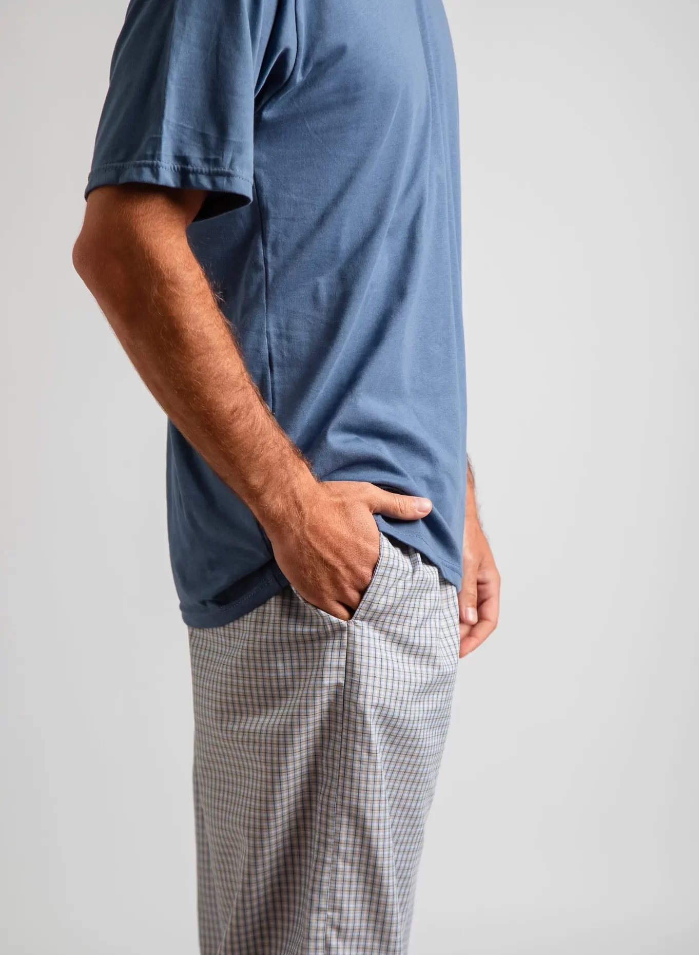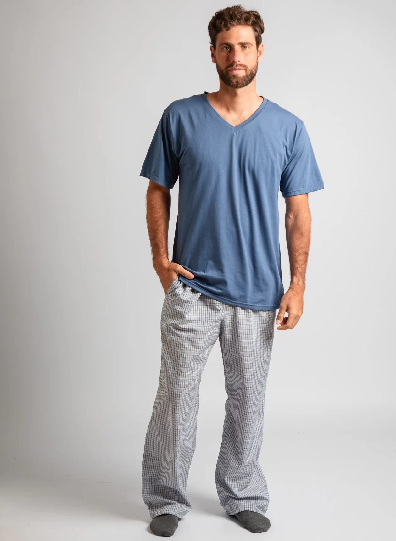 Pijama de dos piezas que incluye un polo de manga corta con cuello en V y un pantalón con bolsillos, con estampado de cuadrados. Su acabado en tela liviana y diseño moderno lo convierten en el favorito para estar en casa.