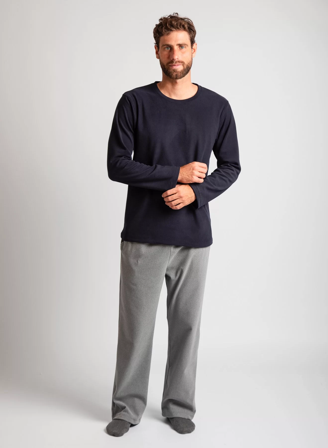 Disfruta del confort absoluto con nuestro nuevo Pijama Perchado, un diseño de dos piezas que combina estilo y comodidad: polo de manga larga con cuello redondo y un pantalón con bolsillos para mayor funcionalidad. Su acabado perchado lo hace suave al tacto e ideal para el invierno.