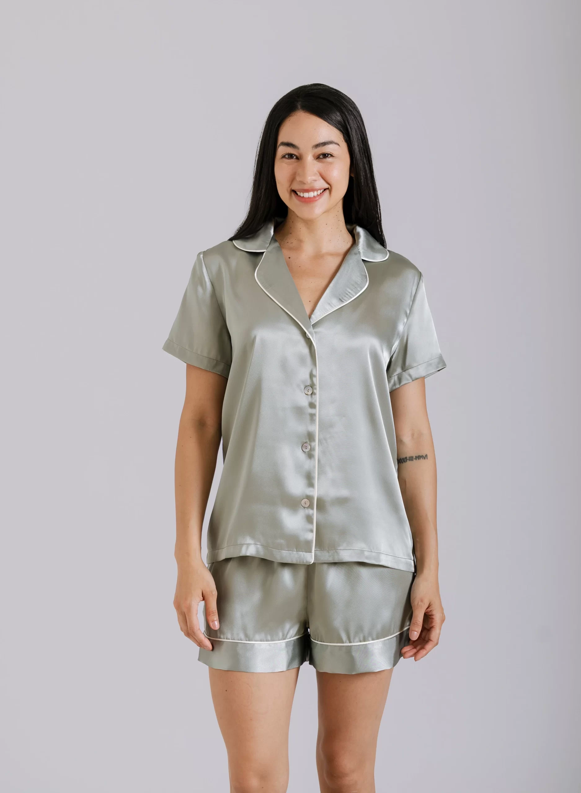 Nuevo pijama confeccionado en satín de seda, con un acabado suave y brillante. Incluye un polo tipo camisa de caída ligera y un short clásico con bolsillos para mayor comodidad. Hecho a mano por mujeres peruanas.