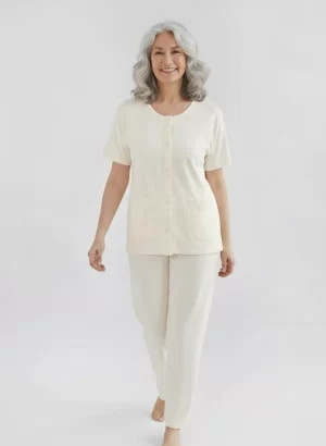 Pijama en 100% algodón peruano. Estilo clásico clásico, corte ancho y cómodo. Polo con botones funcionales, de manga corta. Pantalón largo con bolsillos laterales.