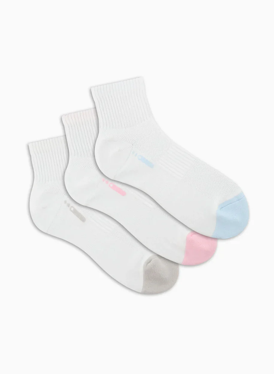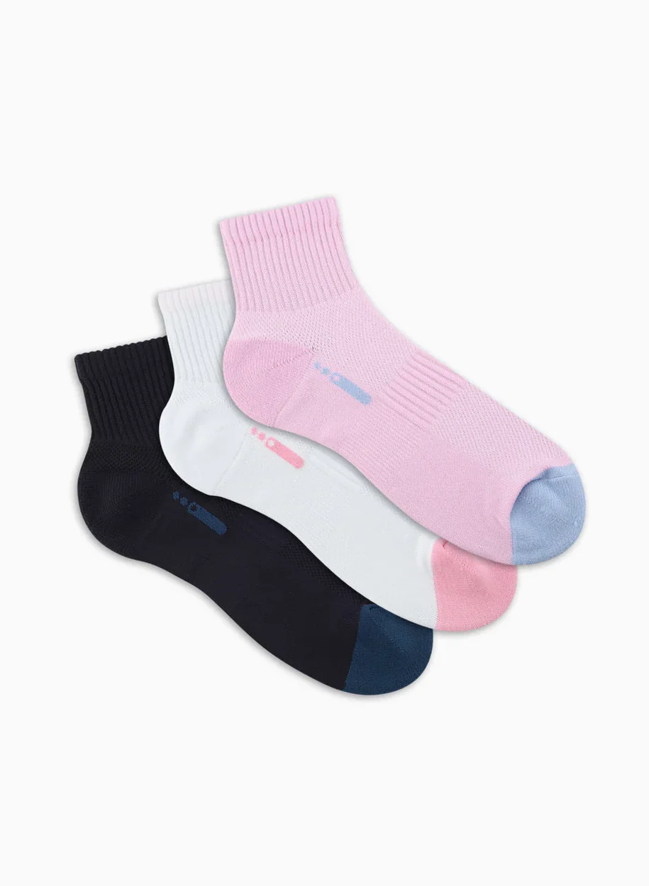 Medias deportivas largas para mujer. Incluye 3 pares. Hechas con microfibra, una fibra que protege de los rayos ultravioletas. Cuenta con tejido toalla que brinda amortiguación en el talón. Protección con banda elástica para mayor ajuste y soporte. Con tejido abierto tipo malla que mejora la transpiración. De fácil lavado, secado rápido, suave, durable, que no se deforma ni se arruga. Hecho en Colombia.