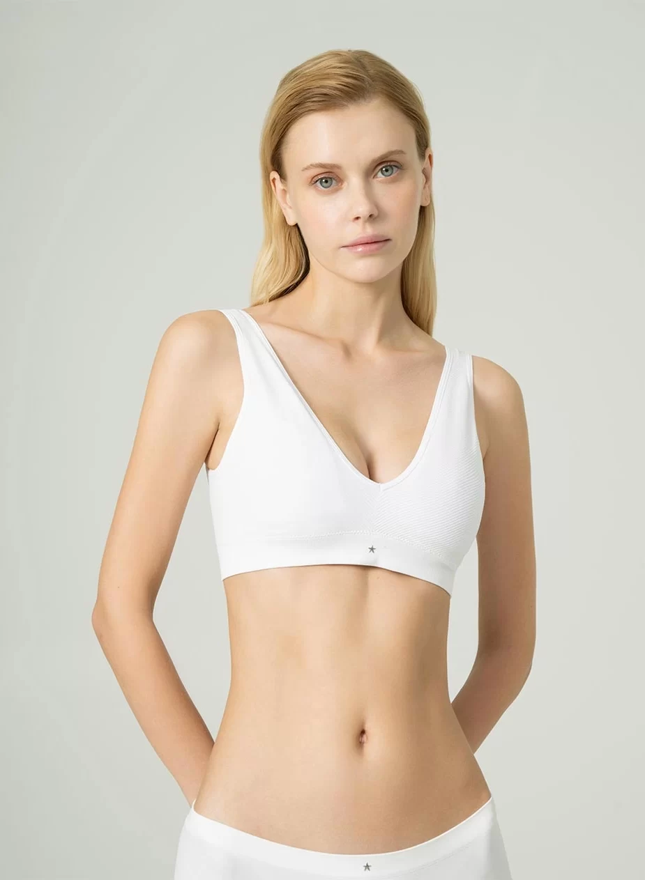 Nuevo Bratop Sin Costura, un modelo sin copa diseñado para brindar comodidad. Su confección con tecnología de corte laser lo hace invisible bajo la ropa, mientras que su tejido elástico, tiras anchas y broche de tres ganchos en la espalda aseguran un ajuste firme.
