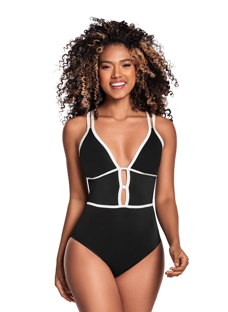 Ropa de baño entero modelante: con control de abdomen moderado. Sus copas son removibles y su escote en V. Detalle de sesgos sobrepuestos en contraste de color. Protección contra rayos UV. Tecnología para mayor durabilidad de los colores