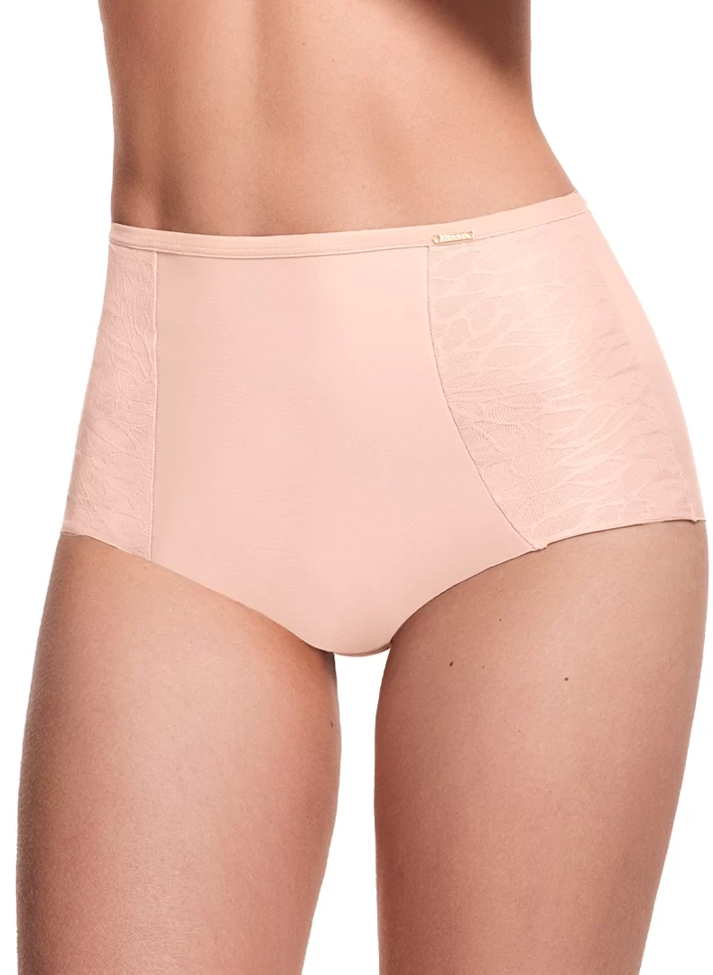 Nueva Trusa de Control Medio. De talle alto, proporciona un control medio que ayuda a suavizar y modelar la zona del abdomen bajo, creando una silueta más estilizada. La parte trasera ofrece buen cubrimiento, mientras su diseño combina tela lisa en la parte frontal y posterior con laterales de tul con textura, con refuerzo intímo de 100% algodón. Hecho en Colombia.